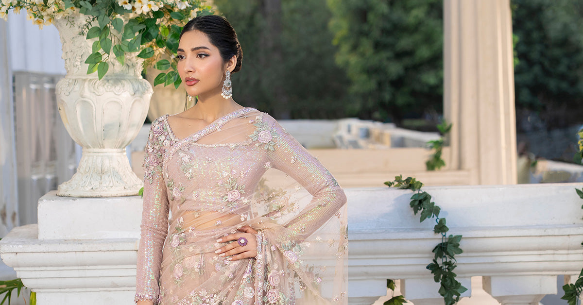The Ethereal Bloom - Drape yourself in sheer elegance with our delicately embroidered net saree. It is a whisper of luxury, hand-embellished with captivating 3D floral appliqués and scattered with luminous pearls. A truly enchanting piece for an everlasting look.