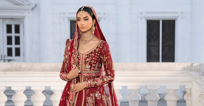 The Shikargah Regalia - Our deep red organza pishwas floats above a raw silk lehenga. Lavishly detailed with mirror work, 3D floral work, shimmering dabka-naqshi and glistening pearl details, this piece is pure passion. Completed with an elegantly draped net dupatta for a truely opulent look.