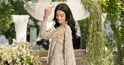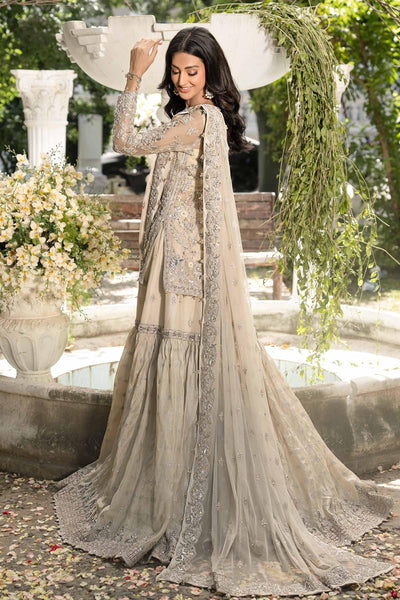 The mirror shimmer. Step into the spotlight with this magnificent Gharara Set. Cascading fabric is illuminated by brilliant sheesha (mirror work) and sparkling crystals. Intricate dabka-naqshi and delicate net florets add depth to the gotta work, creating a piece that moves as beautifully as you do.