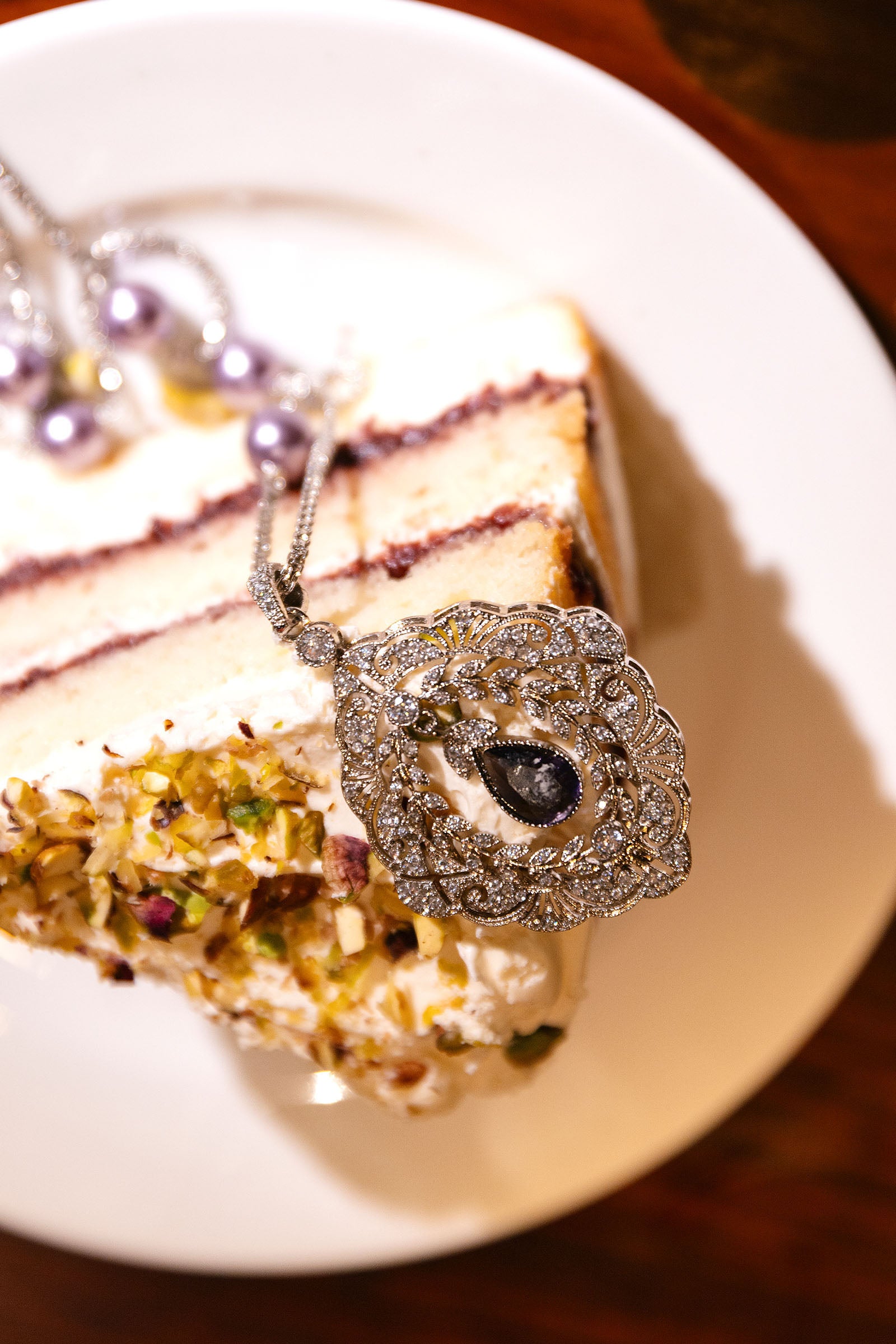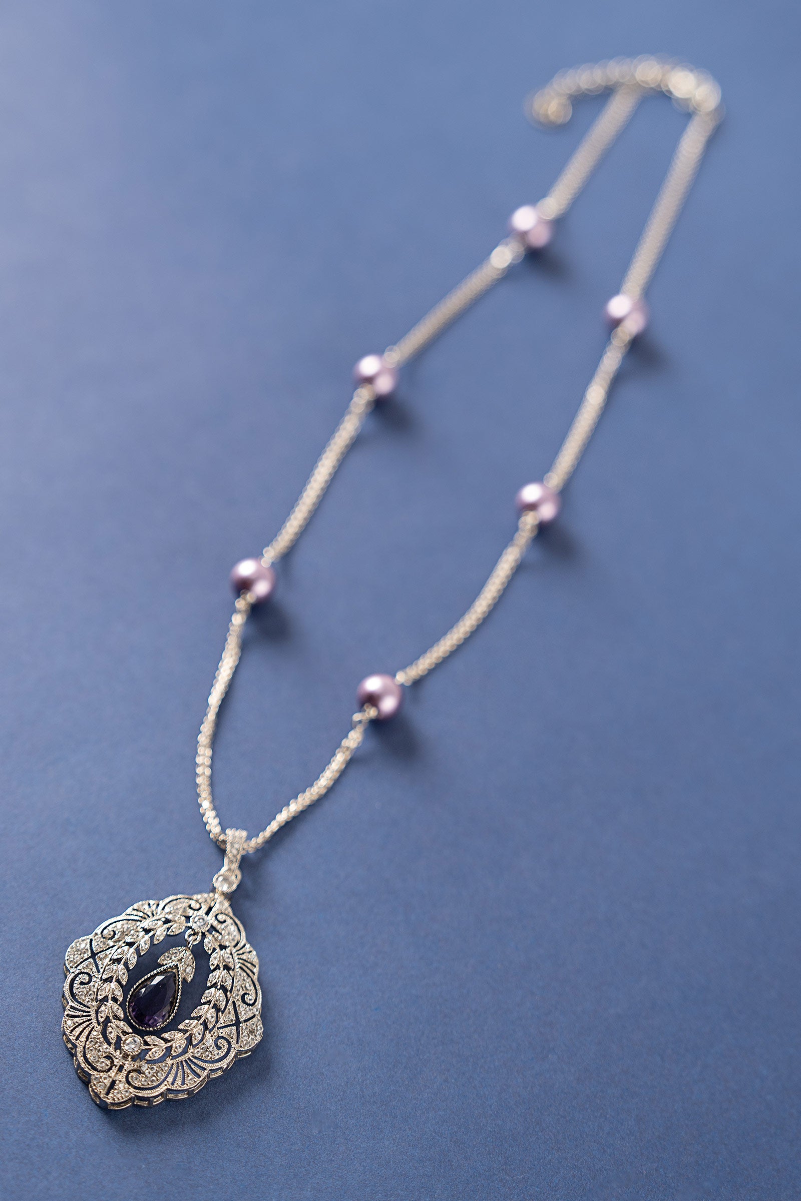 Celebrate festive elegance with this modern yet stunning pendant, adorned with sparkling white and purple zircons, and gracefully finished with a lustrous purple pearl in hanging. A timeless fusion of royal hues and chic sparkle, perfect for adding regal charm to your festive ensemble. Finish: Silver Lock: Spring Lock & Loops Product Care: Wipe Clean