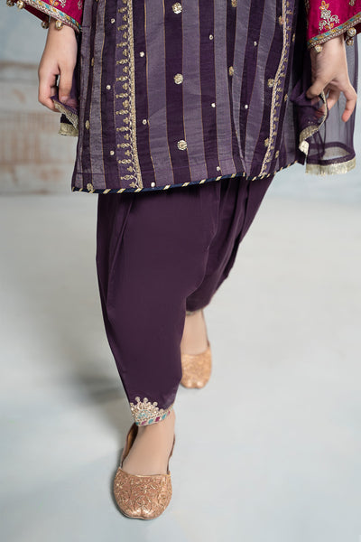Refresh your little ones' wardrobe with our 3 piece embroidered kameez shalwar; featuring a two-tone sequin-tilla embroidered kurta shirt adorned with tilla balls and threadwork and paired with dyed shalwar with thread, sequin-tilla embroidery on the hem and a resplendent dupatta boasting a kiran border.