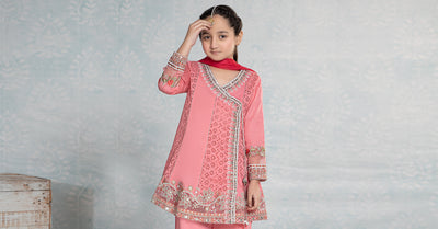 Elevate your little girls style with our 3 piece embroidered lawn suit; featuring a tilla and sequins embroidered angrakha frock adorned with schiffli panels and paired with dyed gharara and dupatta with kiran on borders.