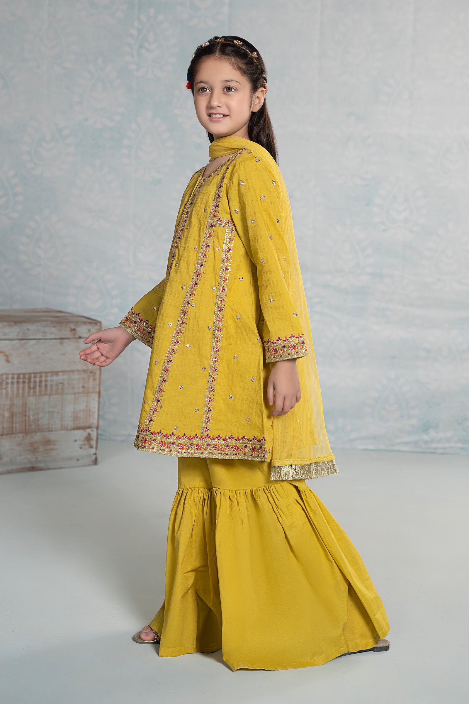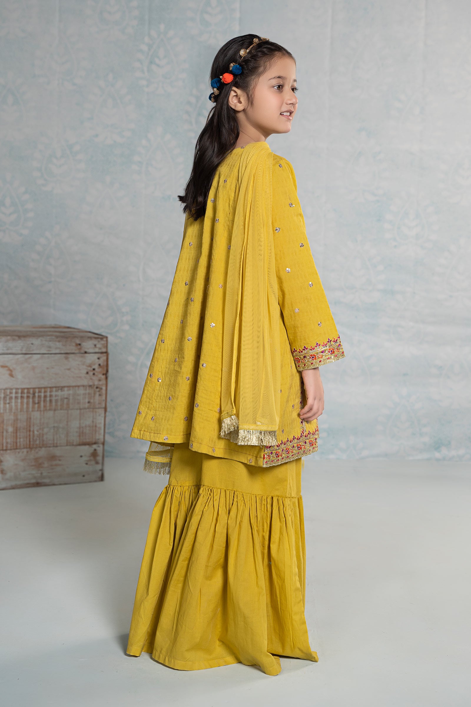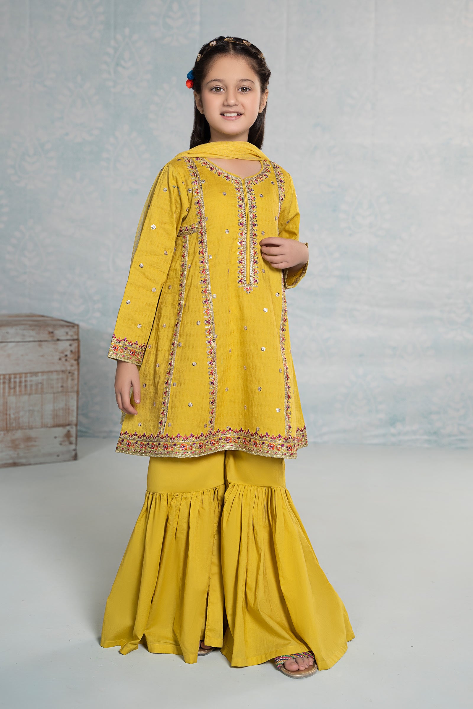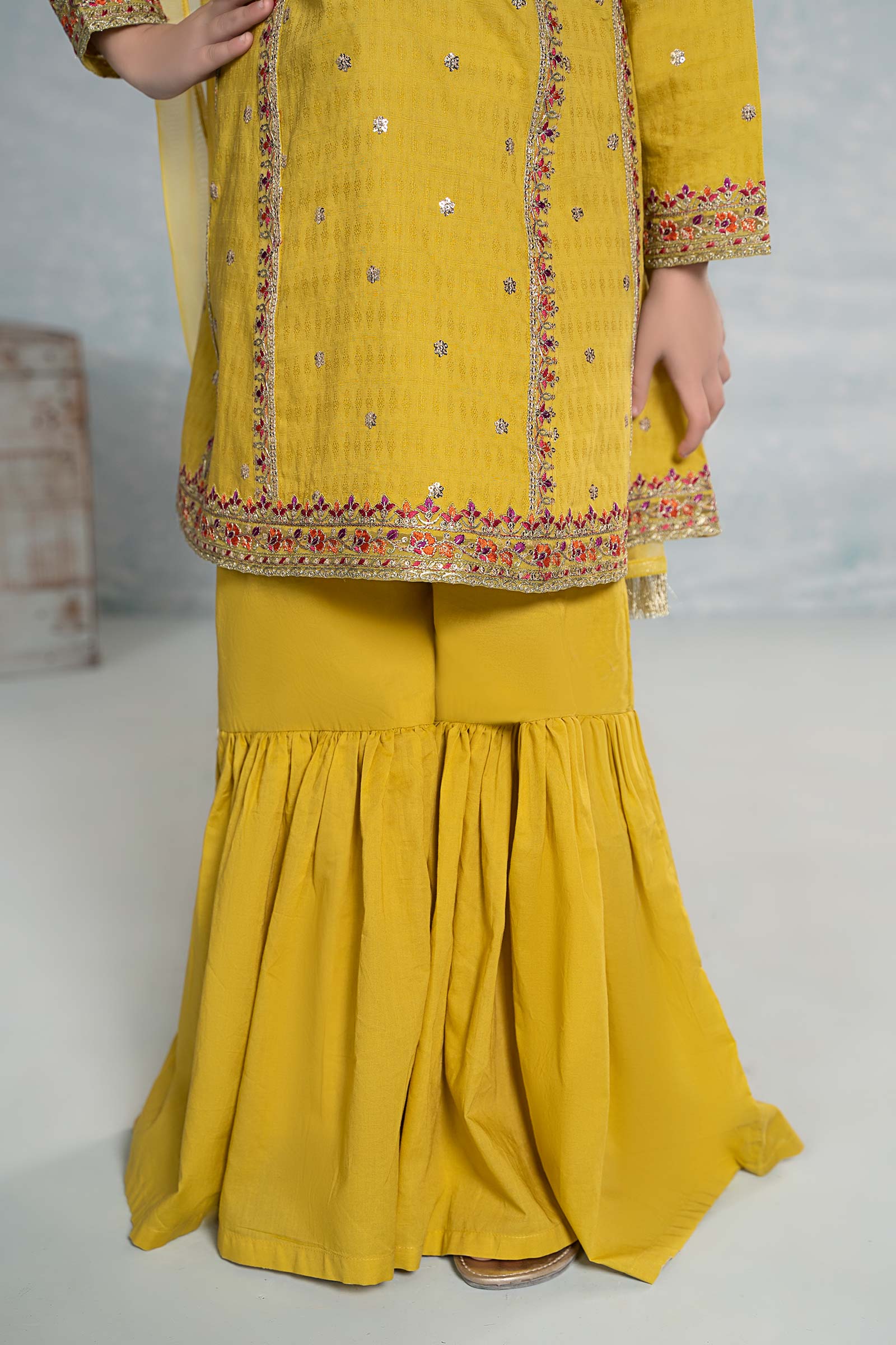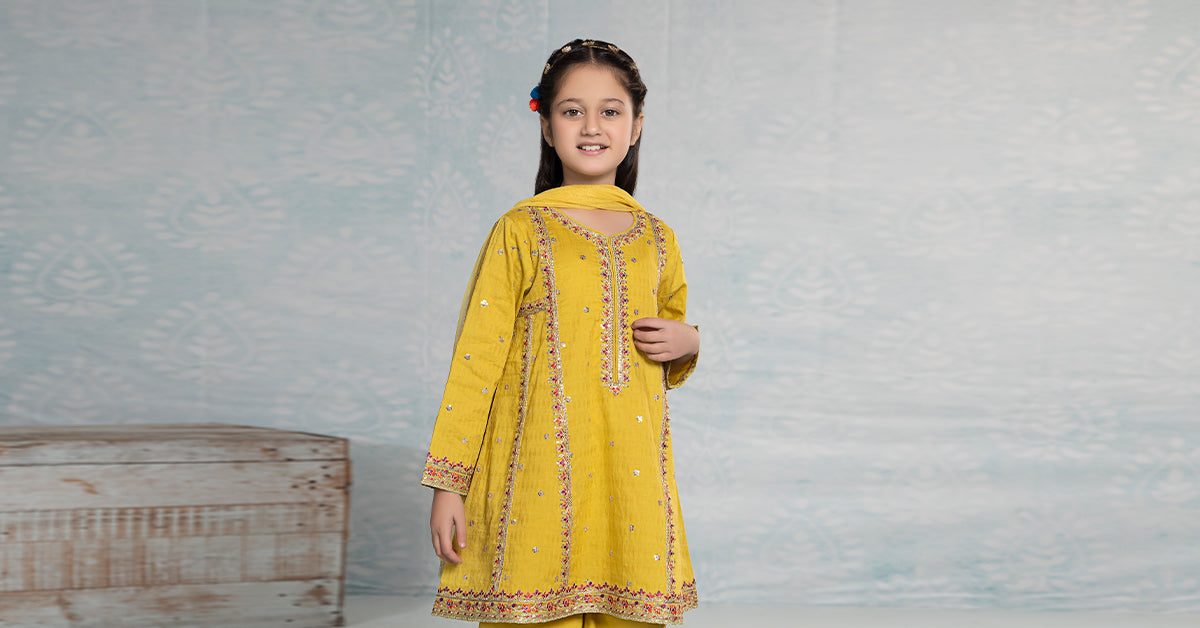 Let your princess exude classic vibes with our 3 piece embroidered dobby suit; featuring a sequin-tilla embroidered shirt embellished with tassels and paired with dyed shalwar with sequin-tilla embroidery on the hem and a dupatta graced with kiran on borders.Shirt Color: YellowFabric: DobbyTrousersColor: YellowFabric: CambricDupatta Color: YellowFabric: NetNote: Only Dry Clean