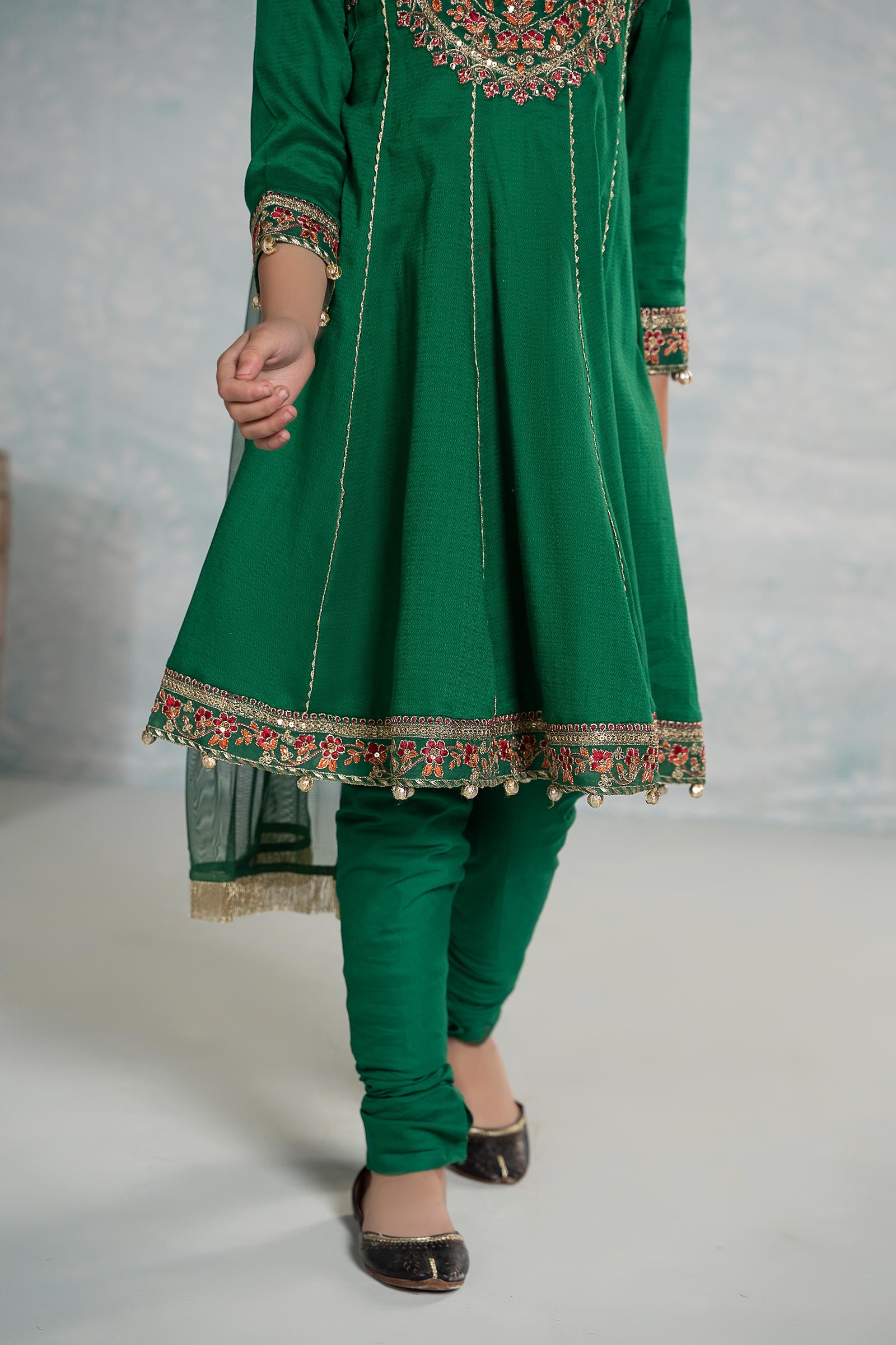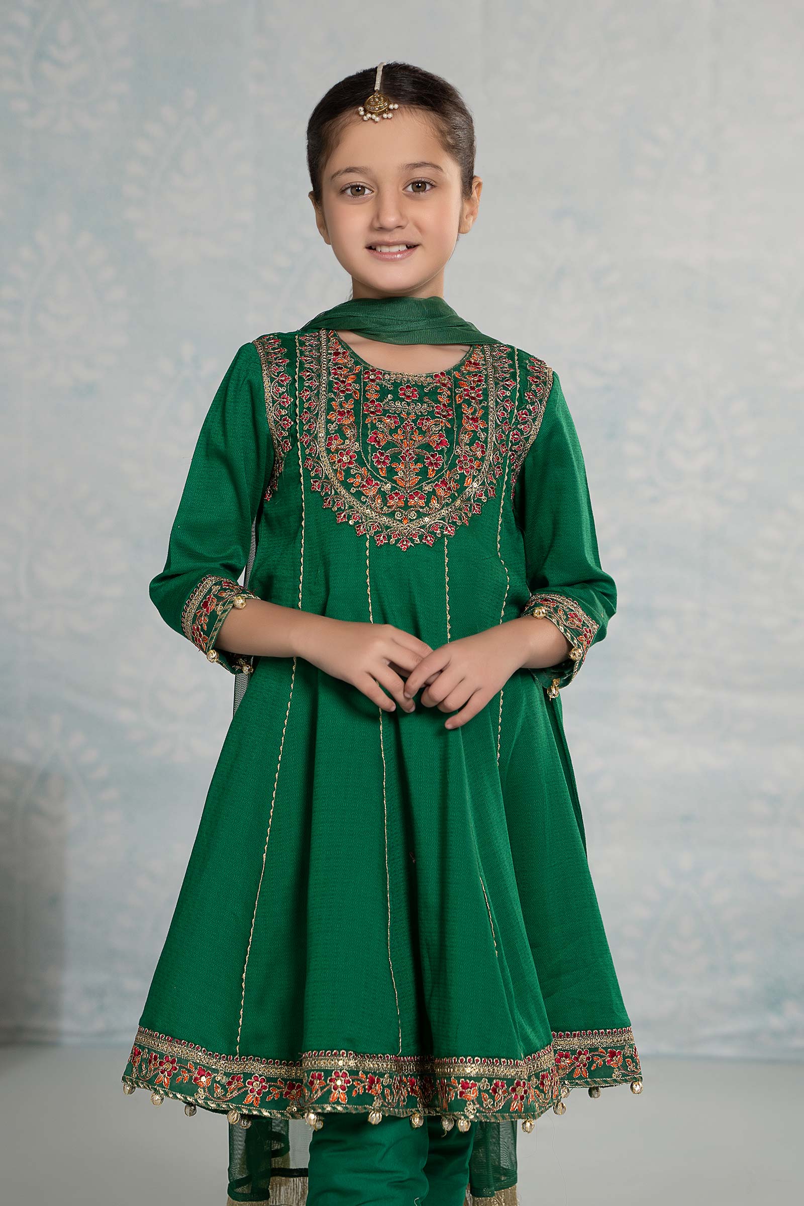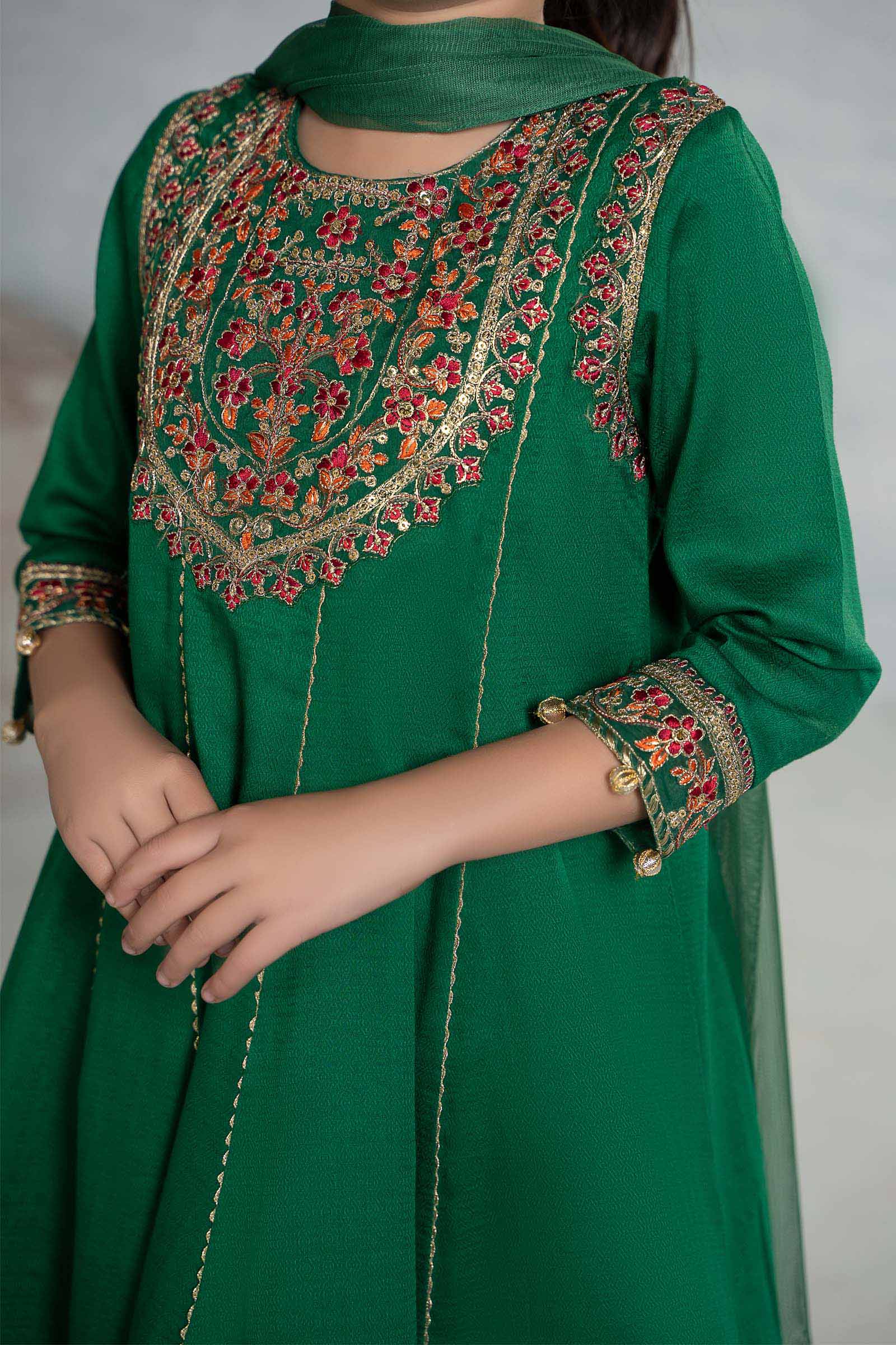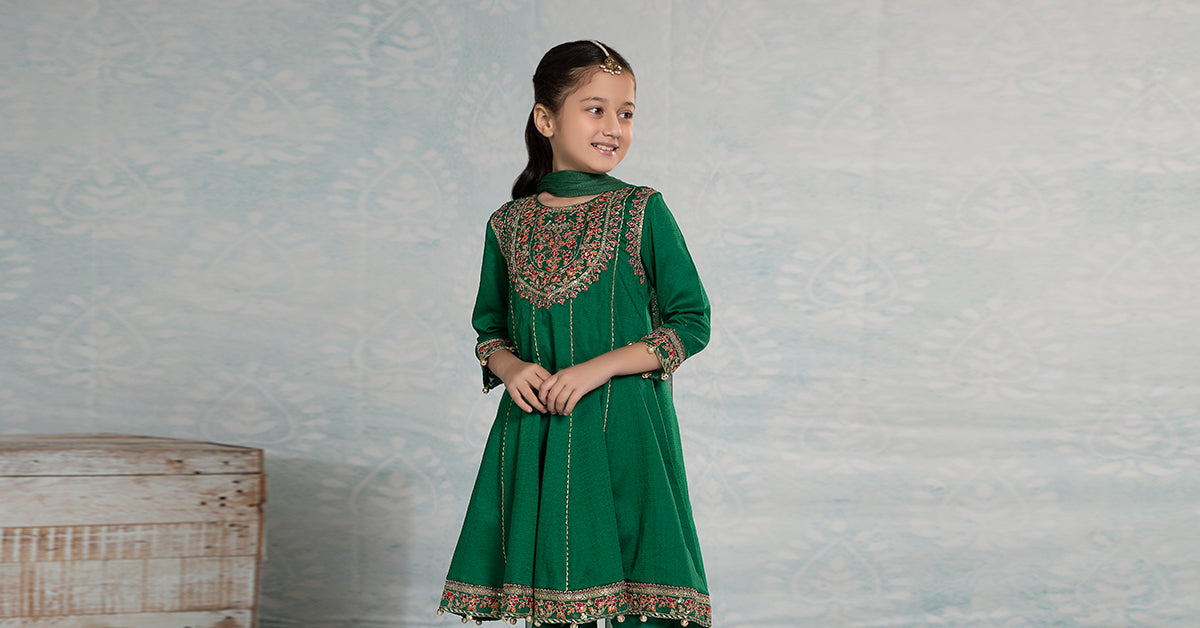 Refresh your little one's wardrobe with our 3 piece embroidered dobby suit, featuring a panel frock with sequin-tilla embroidery. It is combined with a dyed churidar pajama and kiran-border dupatta that instantly captivates.
