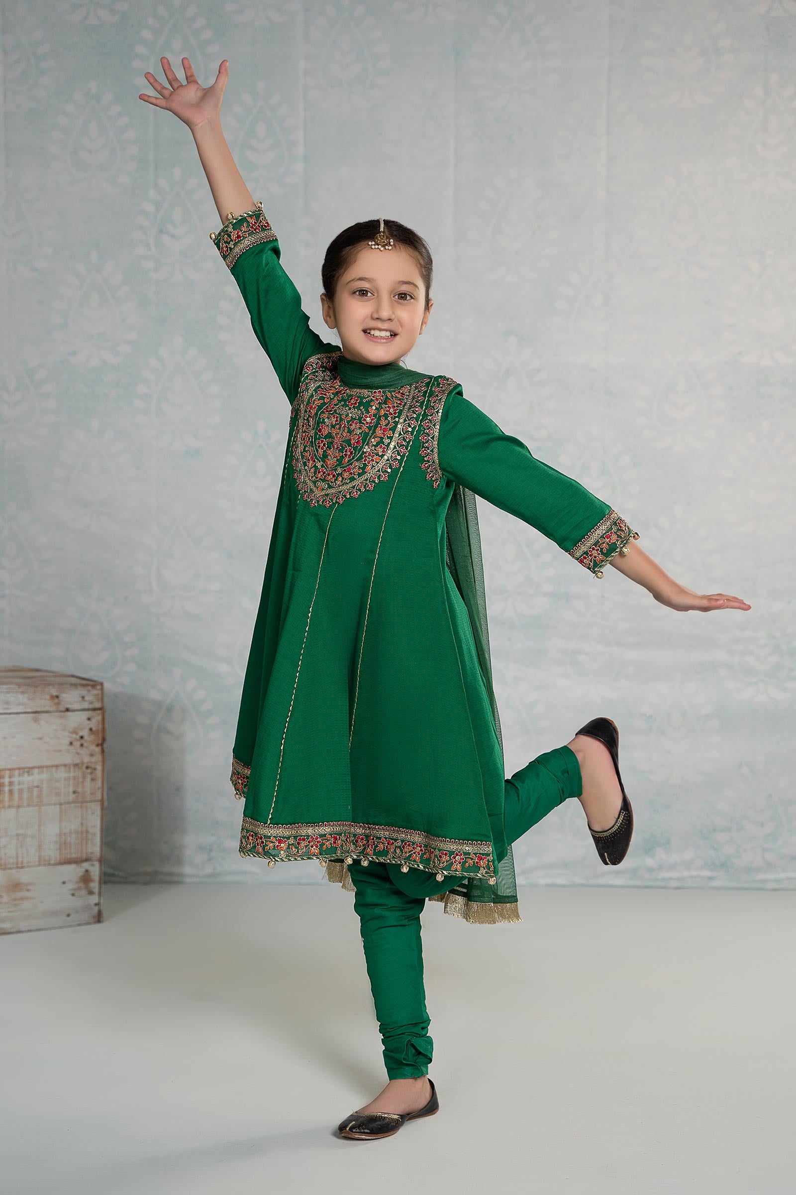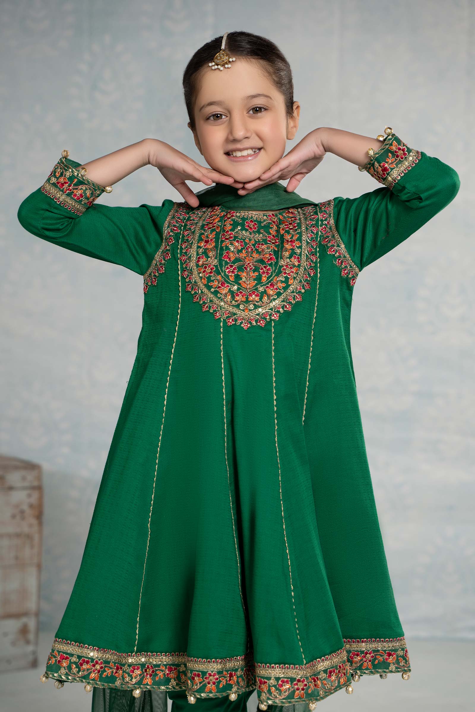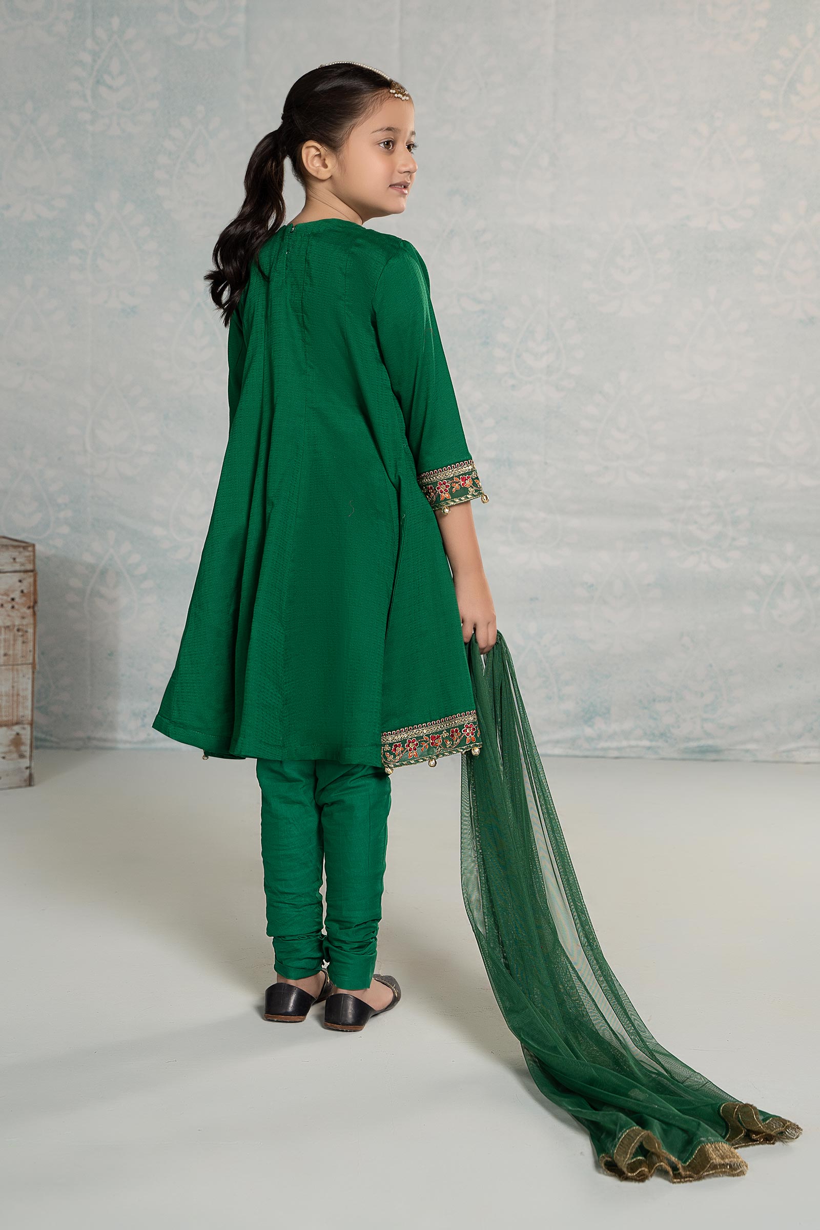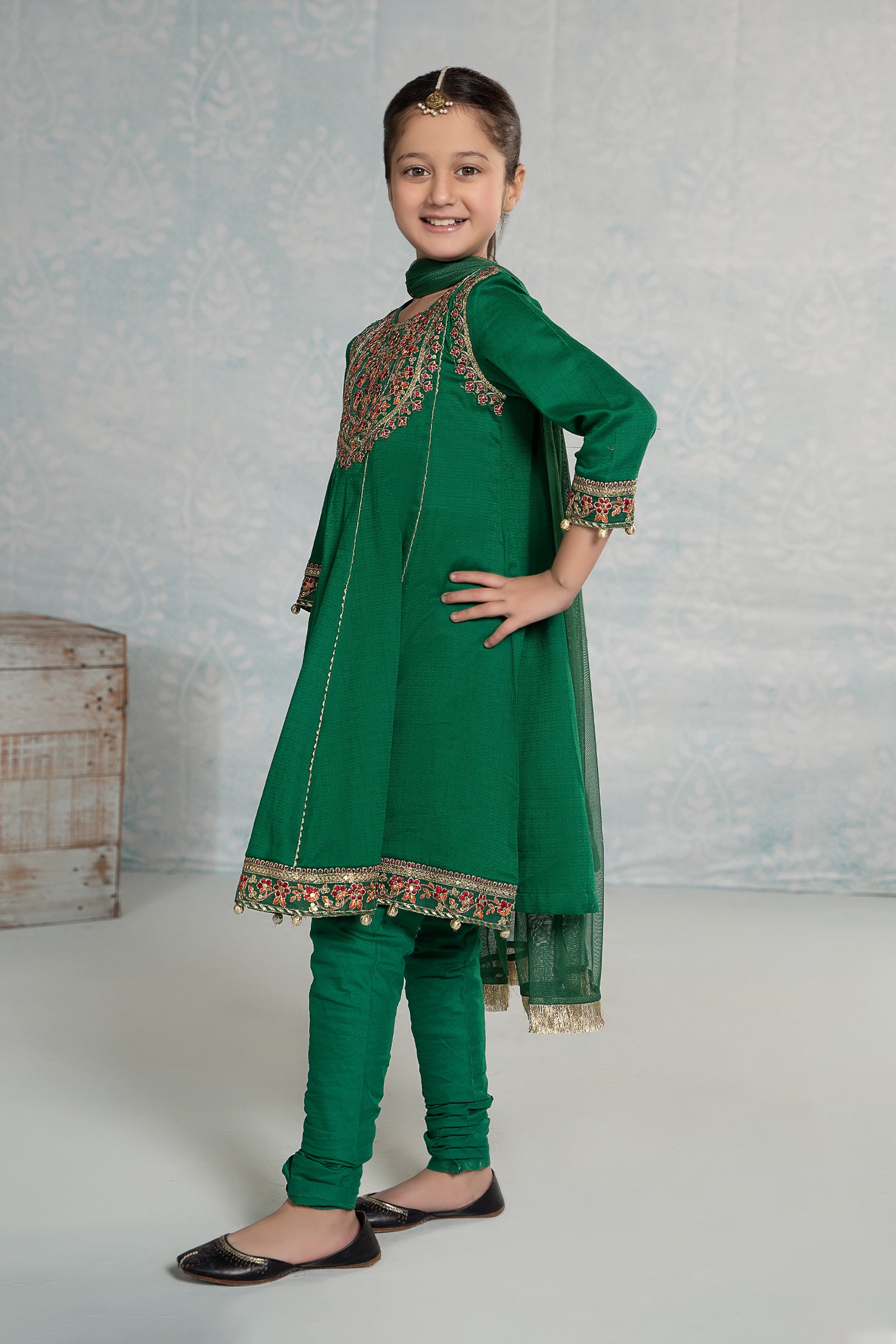 Refresh your little one's wardrobe with our 3 piece embroidered dobby suit, featuring a panel frock with sequin-tilla embroidery. It is combined with a dyed churidar pajama and kiran-border dupatta that instantly captivates.