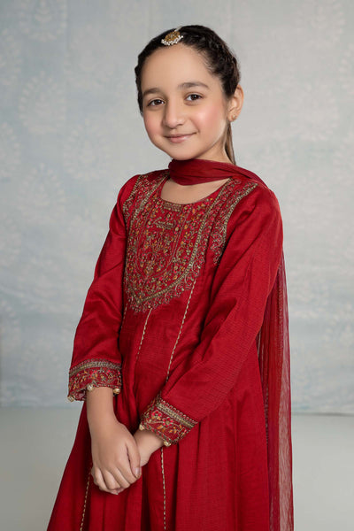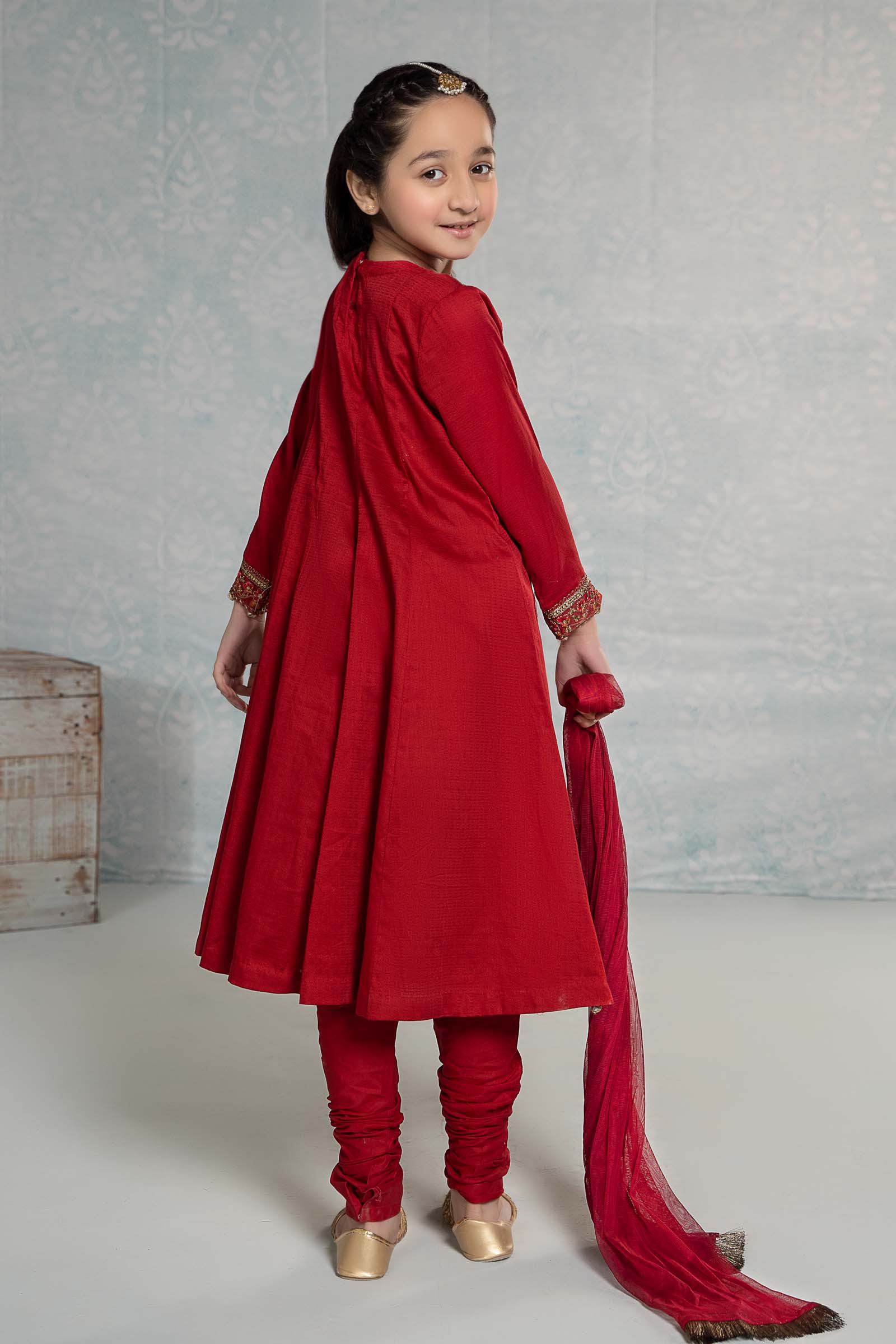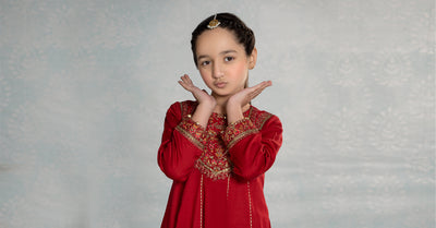 Refresh your little one's wardrobe with our 3 piece embroidered dobby suit, featuring a panel frock with sequin-tilla embroidery. It is combined with a dyed churidar pajama and kiran-border dupatta that instantly captivates.