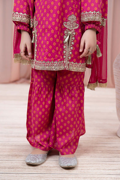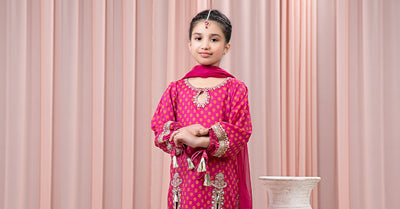 Add a touch of class and elegance to your little ones' wardrobe with our 3 piece embroidered lawn suit; featuring a hyderabadi neckline floral printed shirt graced with sequin-tilla embroidery and tilla balls embellishment and paired with printed gharara and kiran-bordered dupatta, that perfectly complements your festivities.