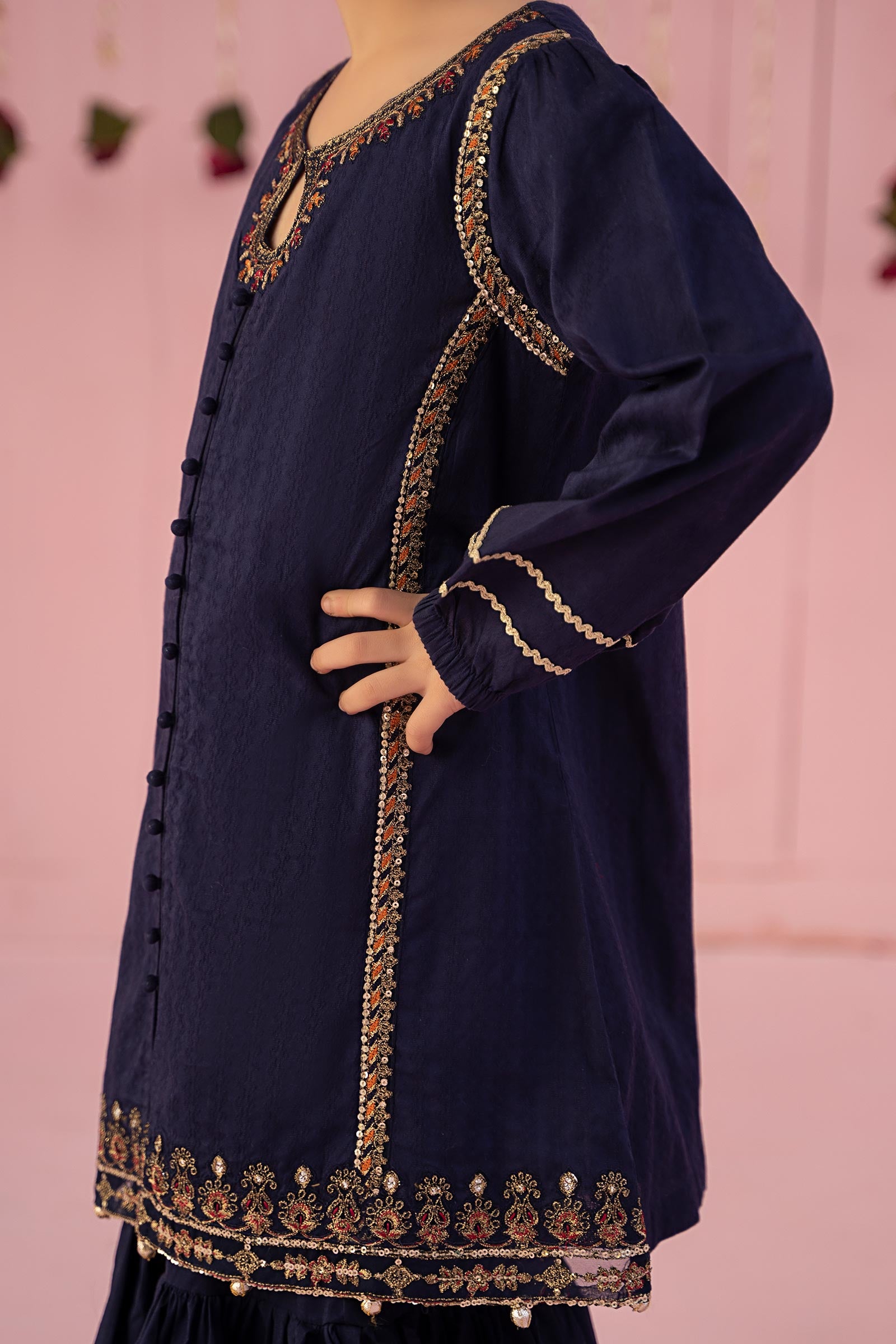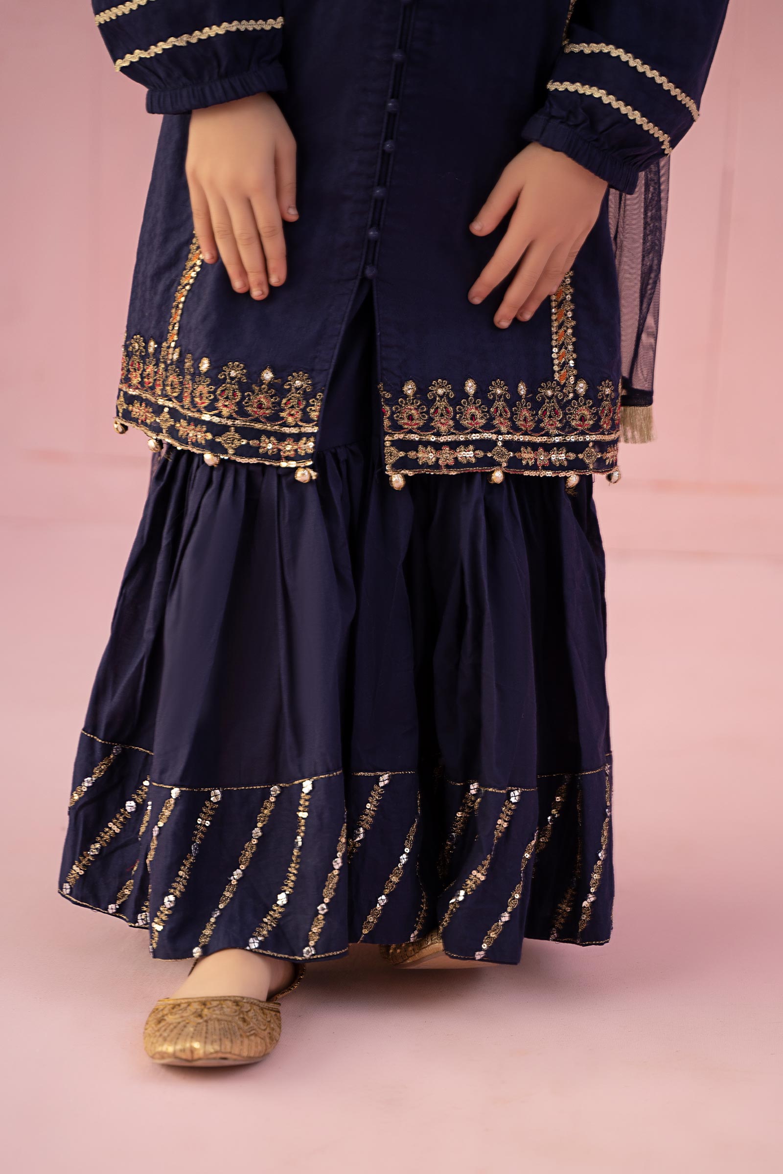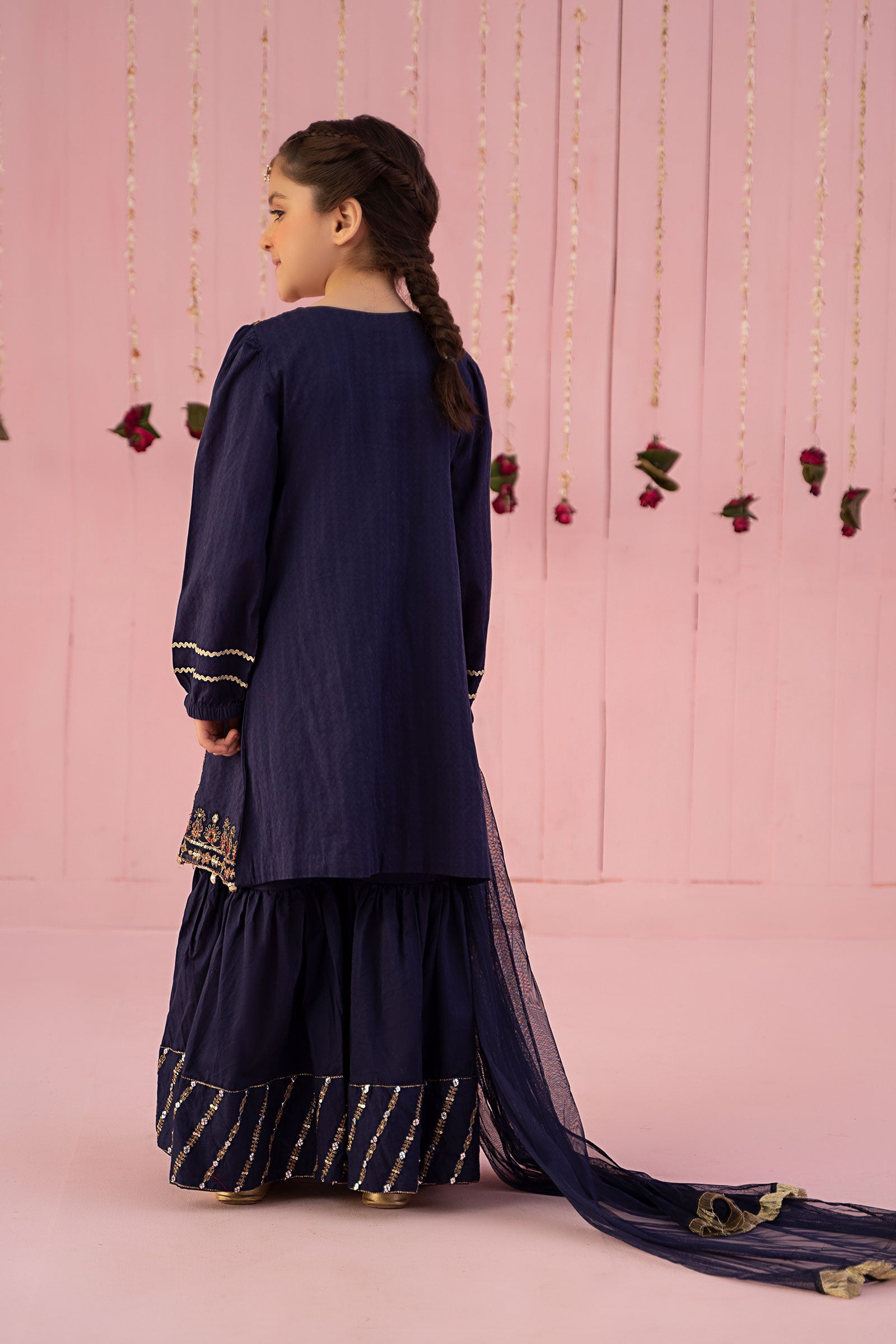 Elevate your little one's wardrobe with our 3 piece embroidered dobby suit; It features a sequin-tilla embroidered panel shirt elevated with button-detailed hyderabadi neckline, gotta laced pleated sleeves and tilla balls embellished border. It comes with dyed gharara with graced with sequin-tilla embroidery on hem and kiran-bordered dupatta, rendered in a blue hue to ffortlessly grace all your soirees.