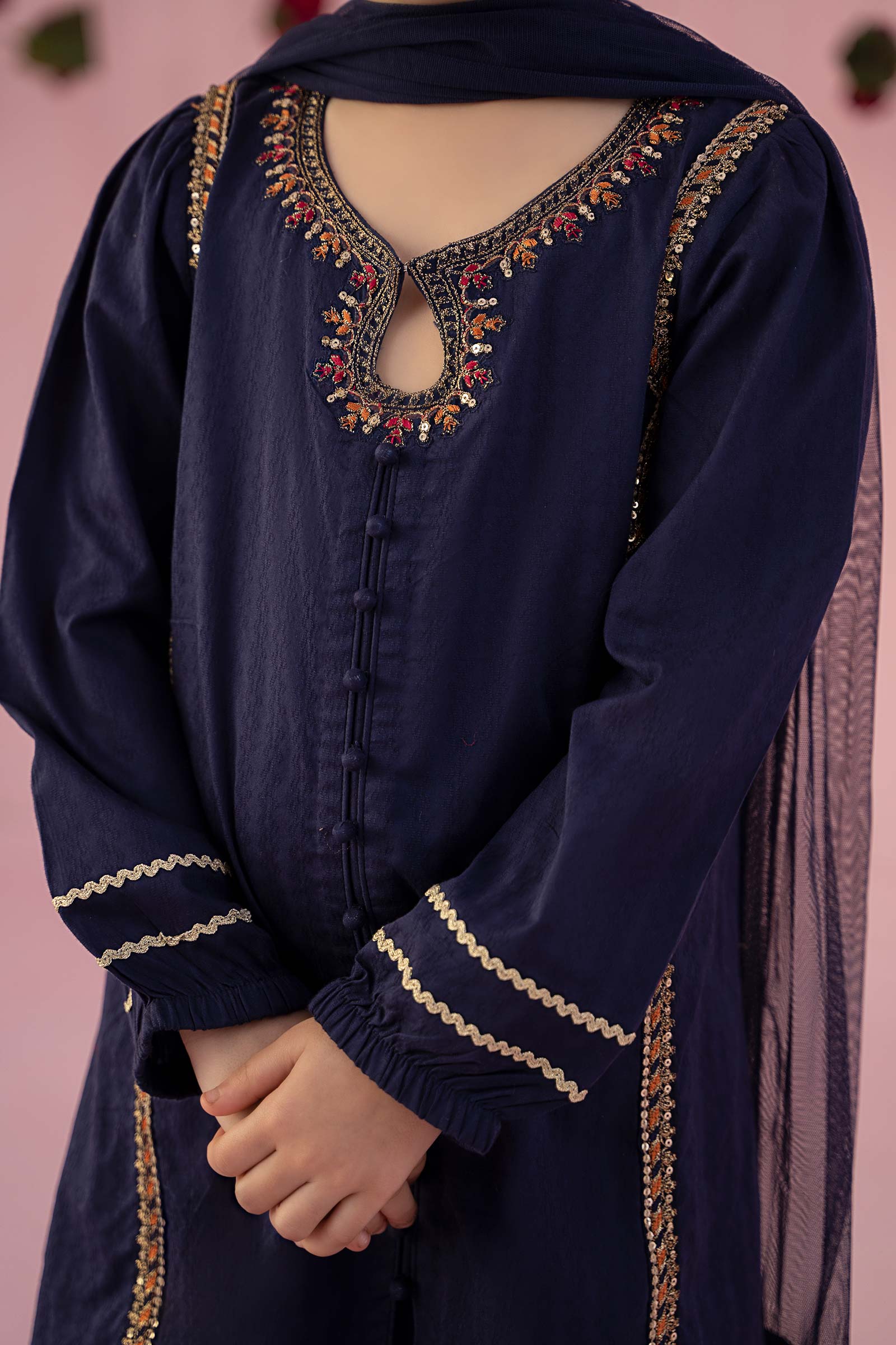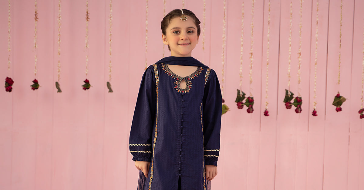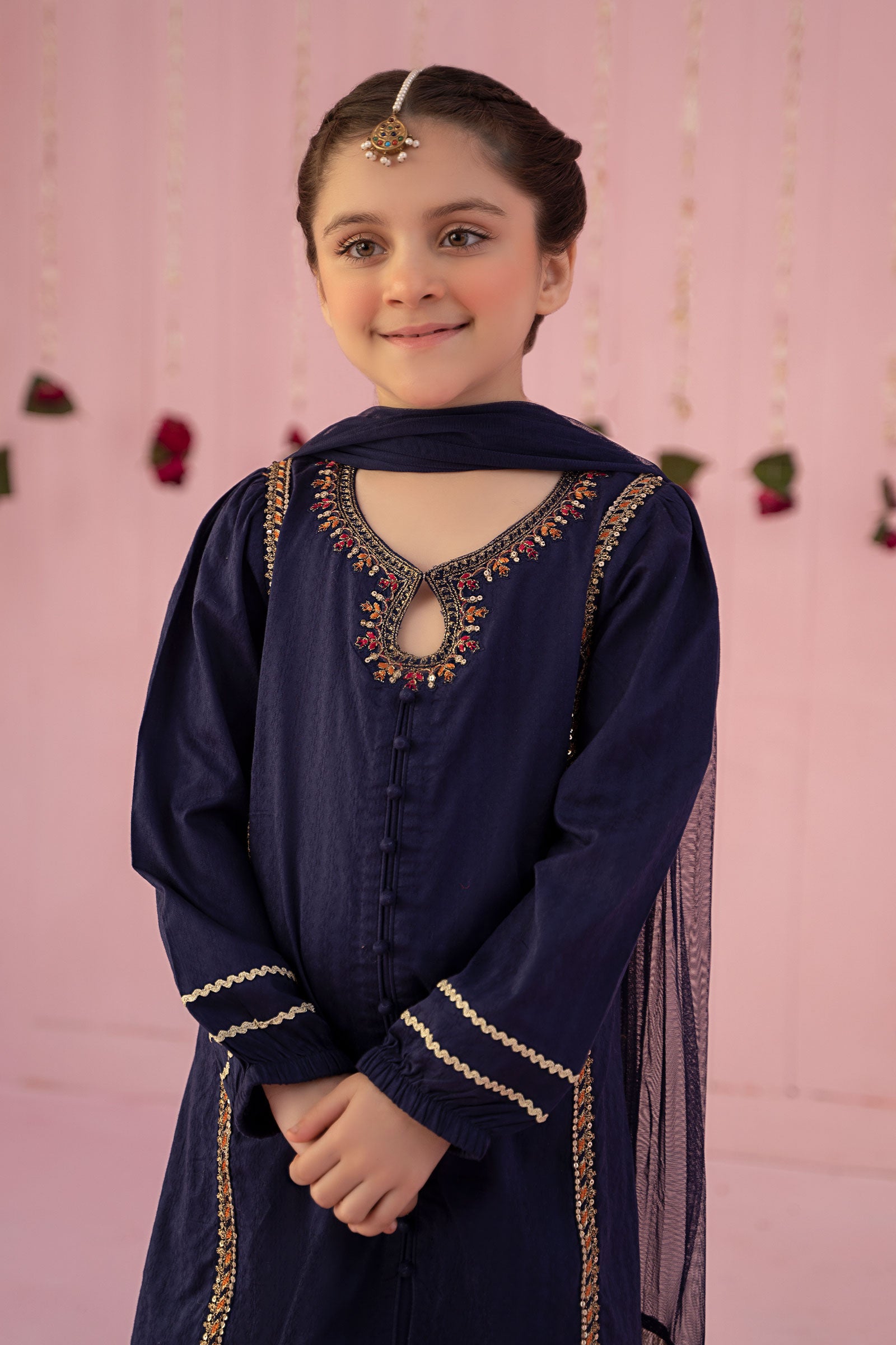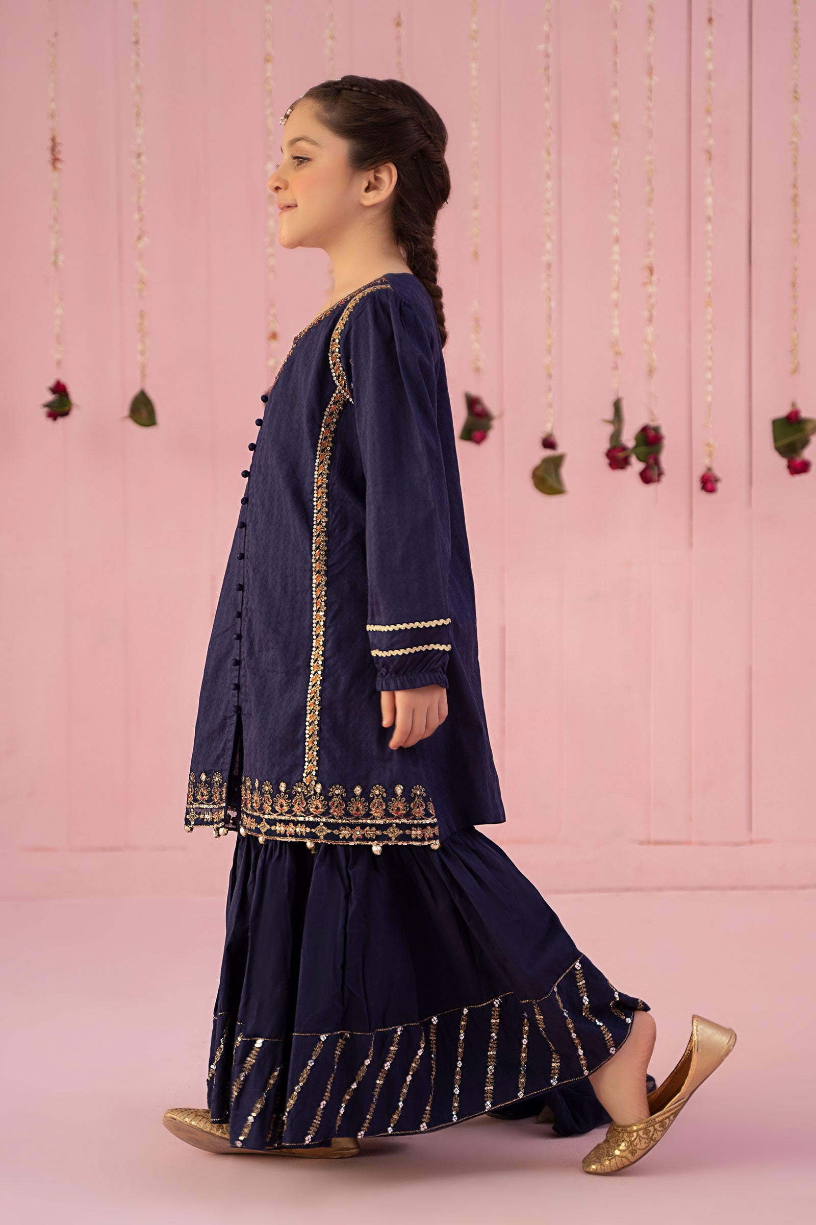 Elevate your little one's wardrobe with our 3 piece embroidered dobby suit; It features a sequin-tilla embroidered panel shirt elevated with button-detailed hyderabadi neckline, gotta laced pleated sleeves and tilla balls embellished border. It comes with dyed gharara with graced with sequin-tilla embroidery on hem and kiran-bordered dupatta, rendered in a blue hue to ffortlessly grace all your soirees.
