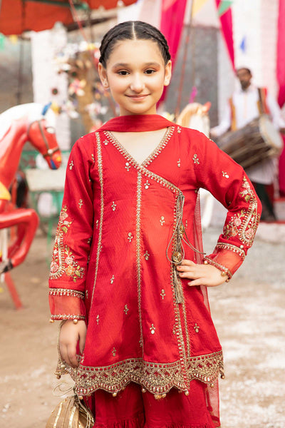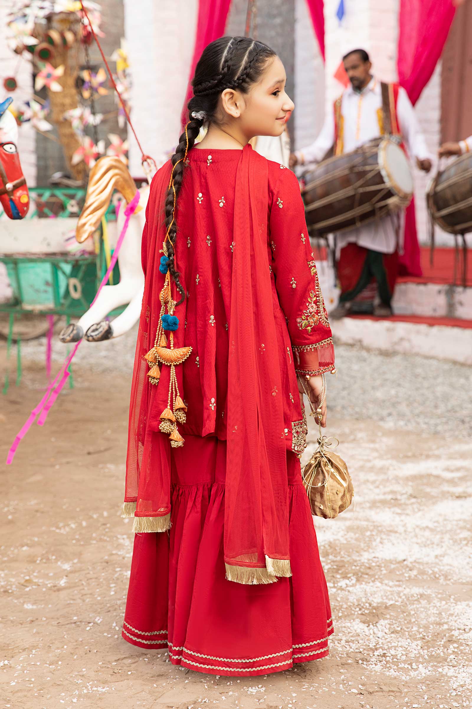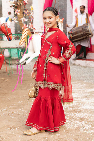 Create a graceful summer look with our 3 piece embroidered dobby suit; featuring a short sequins and tilla embroidered frock, framed with delicate pearls embellishment and paired with gharara with gotta lace detailed hem and dyed dupatta with kiran detailing on borders, making it an effortless choice for all your summer affairs.