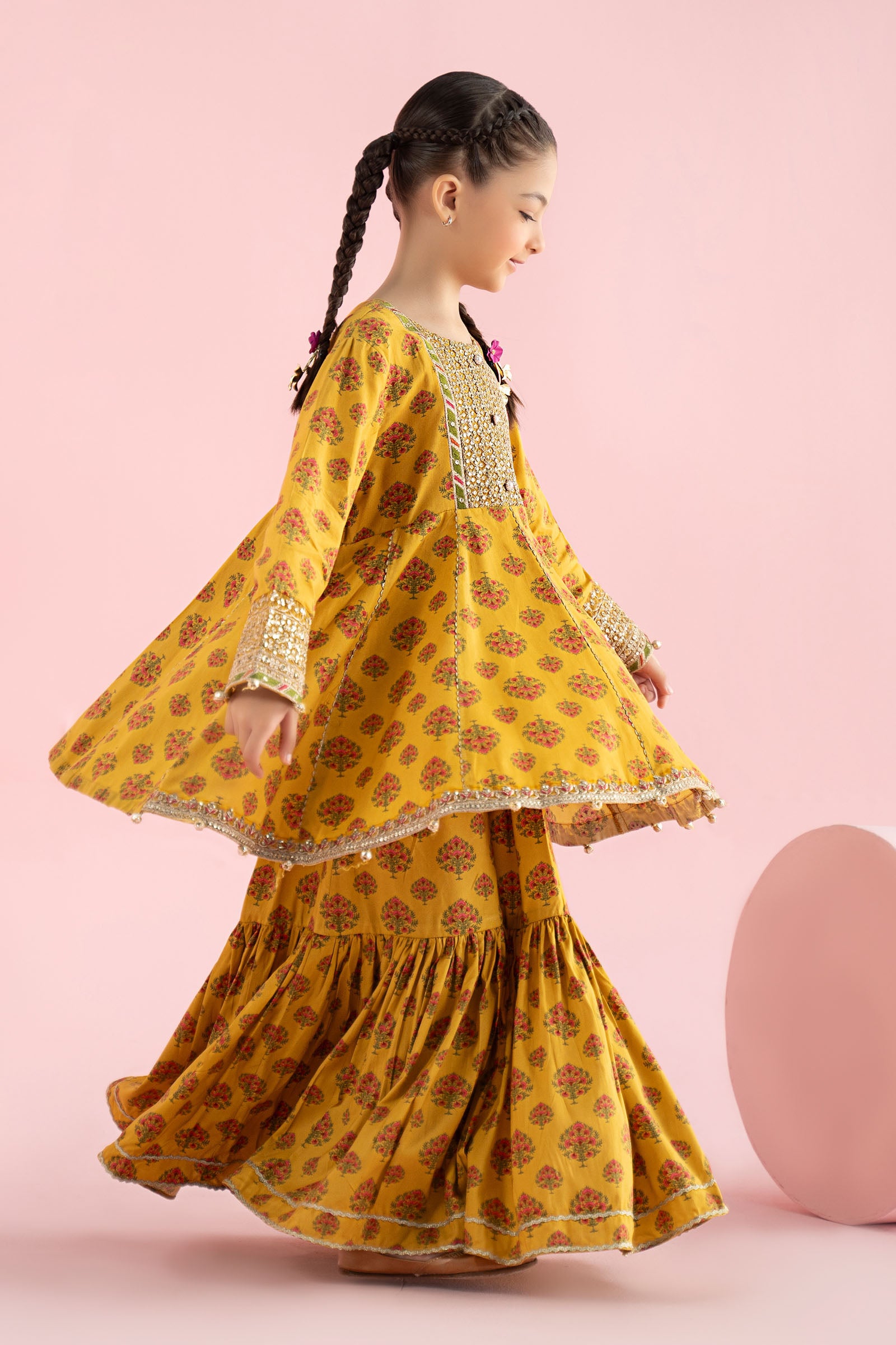 FrockPrinted FrockEmbroidered Round Neckline With Buttons DetailingGotta Lace Detailing On PanelsEmbroidered BorderPrinted Sleeves With Embroidered BorderGotta Balls Drop Detailing On Border & SleevesFit: RegularColor: YellowFabric: LinenGhararaPrinted GhararaElasticated WaistbandGotta Lace Detailing On BorderFit: RegularColor: YellowFabric: LinenDupatta Dyed DupattaColor: YellowFabric: ChiffonWork Details: Sequins, Tilla & Thread EmbroideryModel is wearing 6-8 sizeNote: Dry Clean Only
