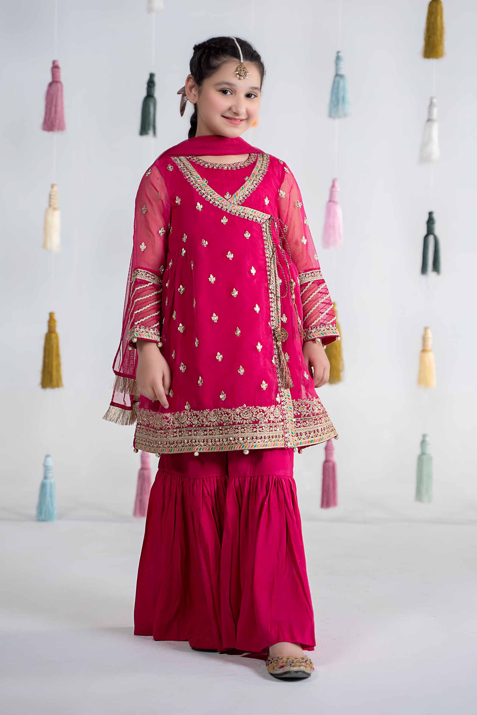 Shirt Front Open AngrakhaEmbroidered Round Neckline With Gotta TasselsPress Button Closure On Back NeckDyed Front With Spray EmbroideryPleats Detailing On Side WaistEmbroidered Front Border With Gotta Balls DetailingEmbroidered Full Length Sleeves With Gotta Lace & Balls Detailing On BorderDyed BackFit: RelaxedColor: PinkFabric: OrganzaUndershirt Dyed Sleeveless UndershirtFit: RelaxedColor: PinkFabric: Raw SilkTrousersDyed GhararaElasticated WaistbandFit: RelaxedColor: PinkFabric: Raw SilkDupatta Dyed DupattaKiran Lace On BordersColor: PinkFabric: NetModel is wearing size 6-8Note: Only Dry Clean