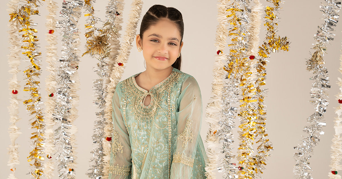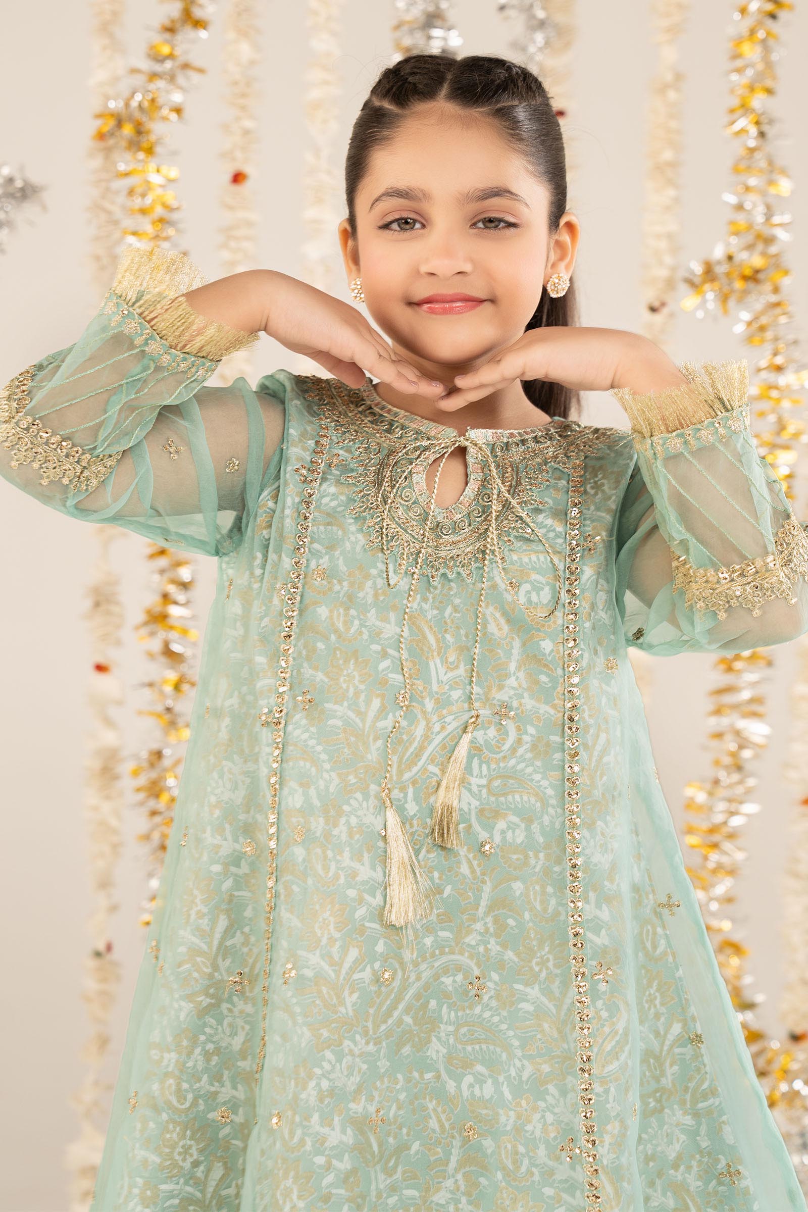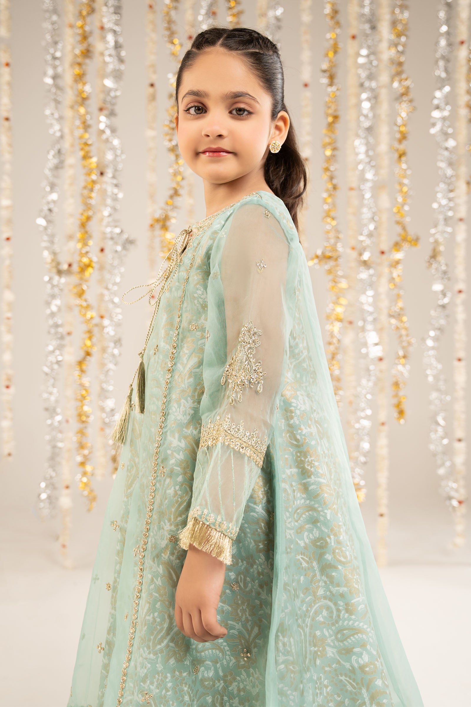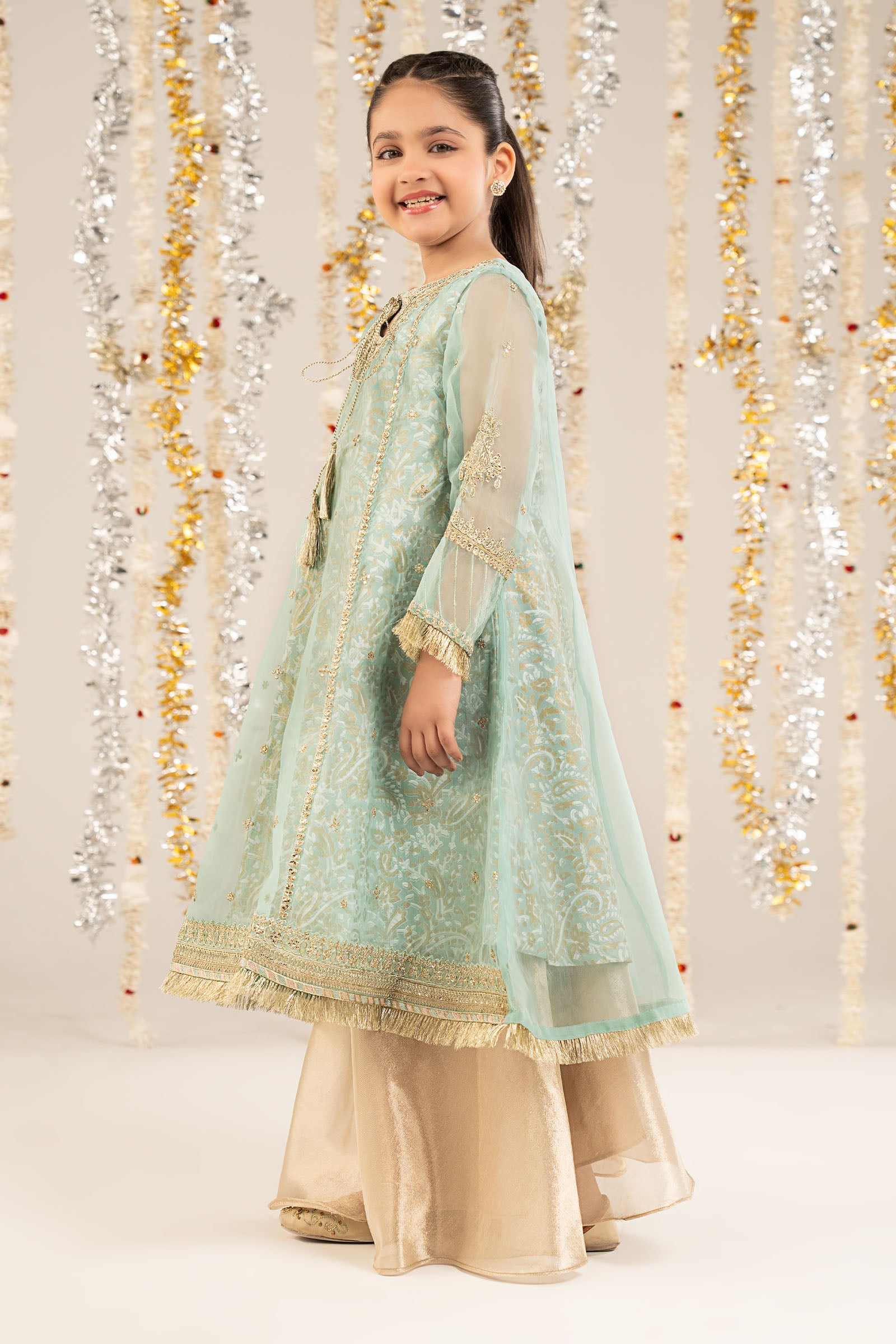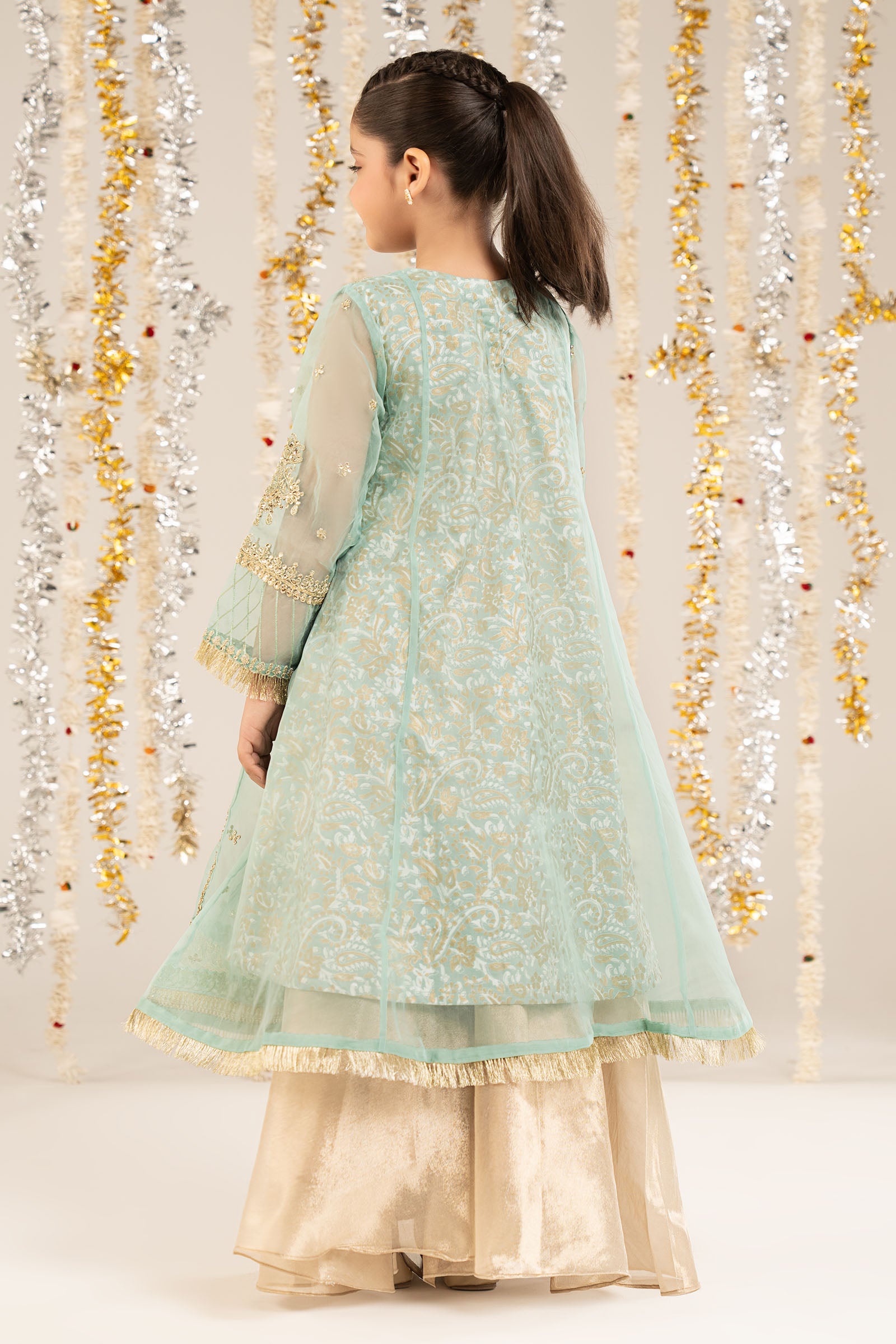 Embroidered long frock with block printed undershirt featuring tassels paired with tissue sharara
