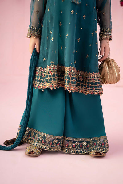 Add a twist to your little one festivities with our 3 piece embroidered organza suit; featuring a short sequins and tilla embroidered frock embellished with tilla balls and paired with dhaka trousers adorned with sequins and tilla embroidery on the hem and a crushed dupatta framed with kiran detailing.