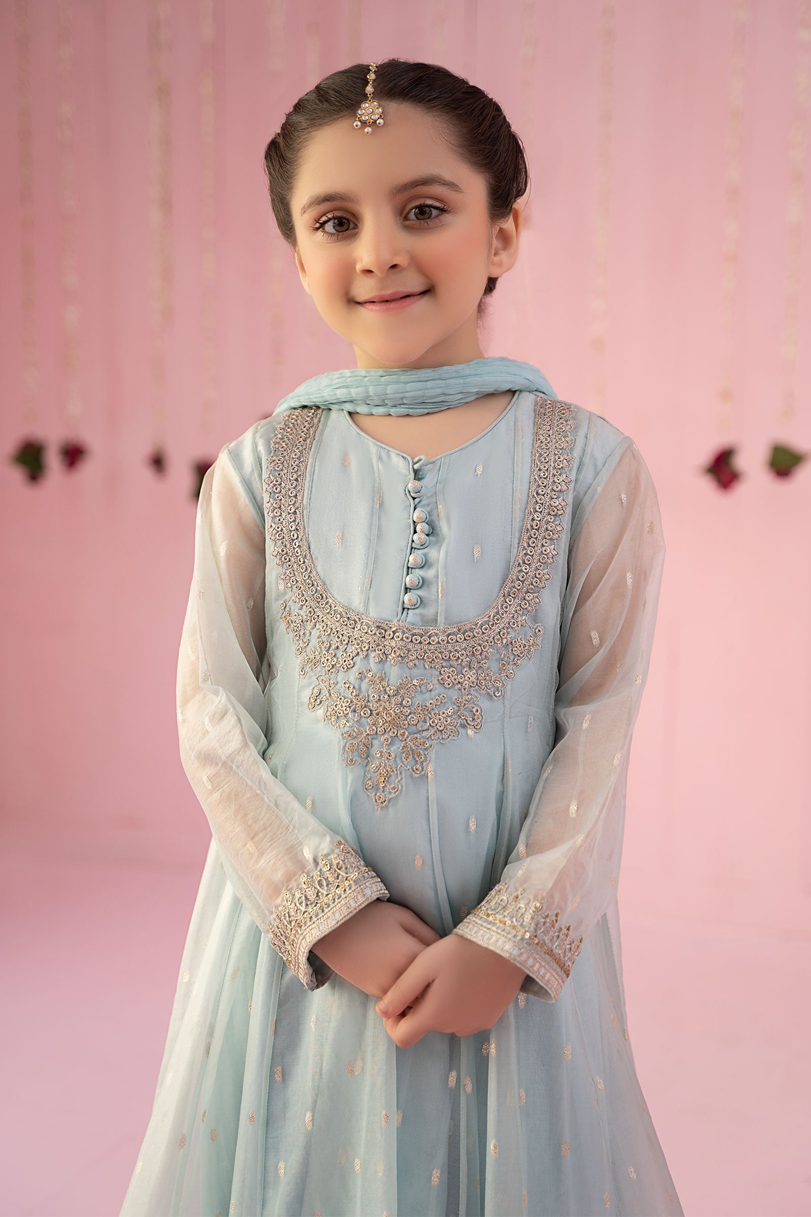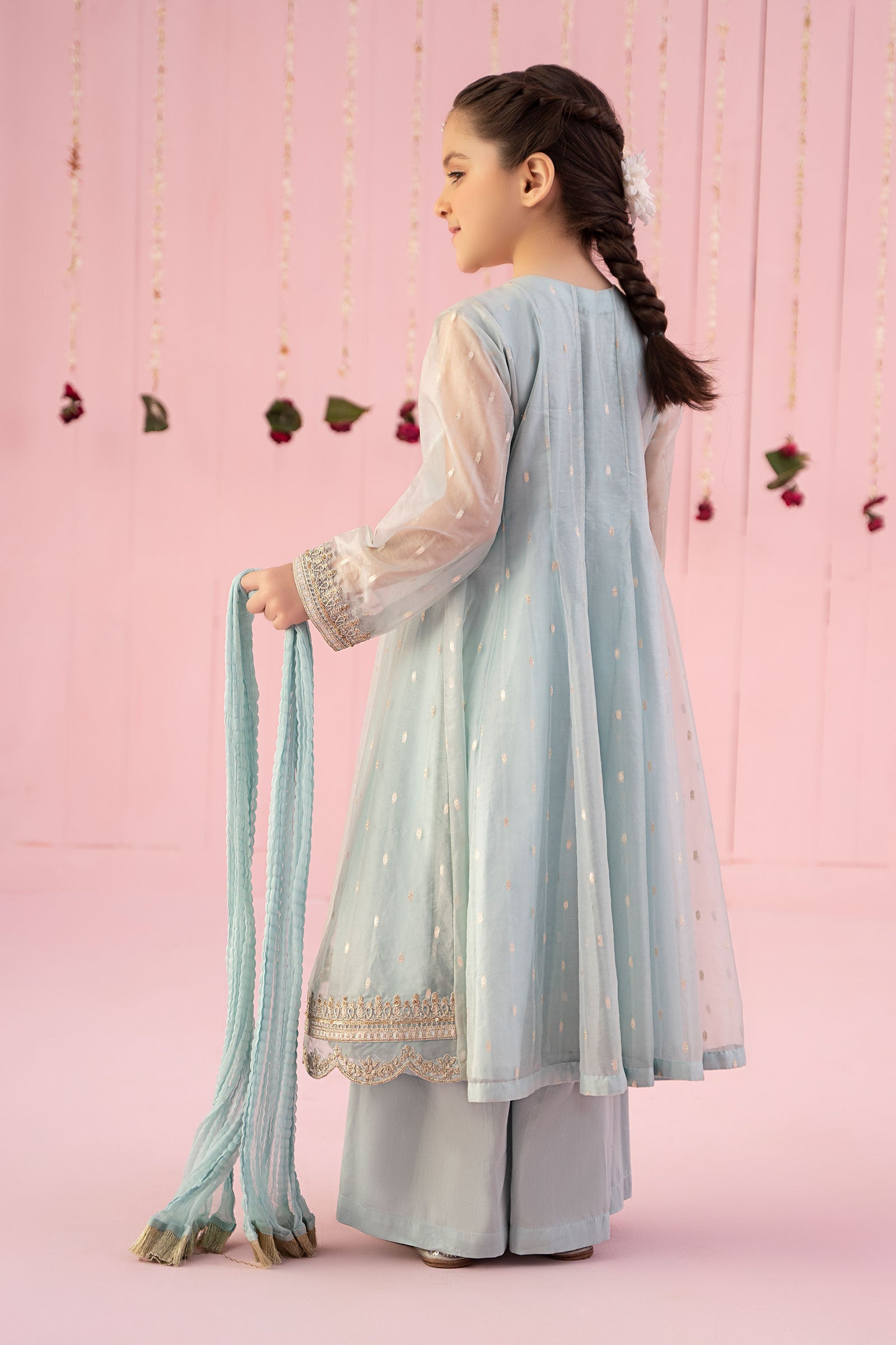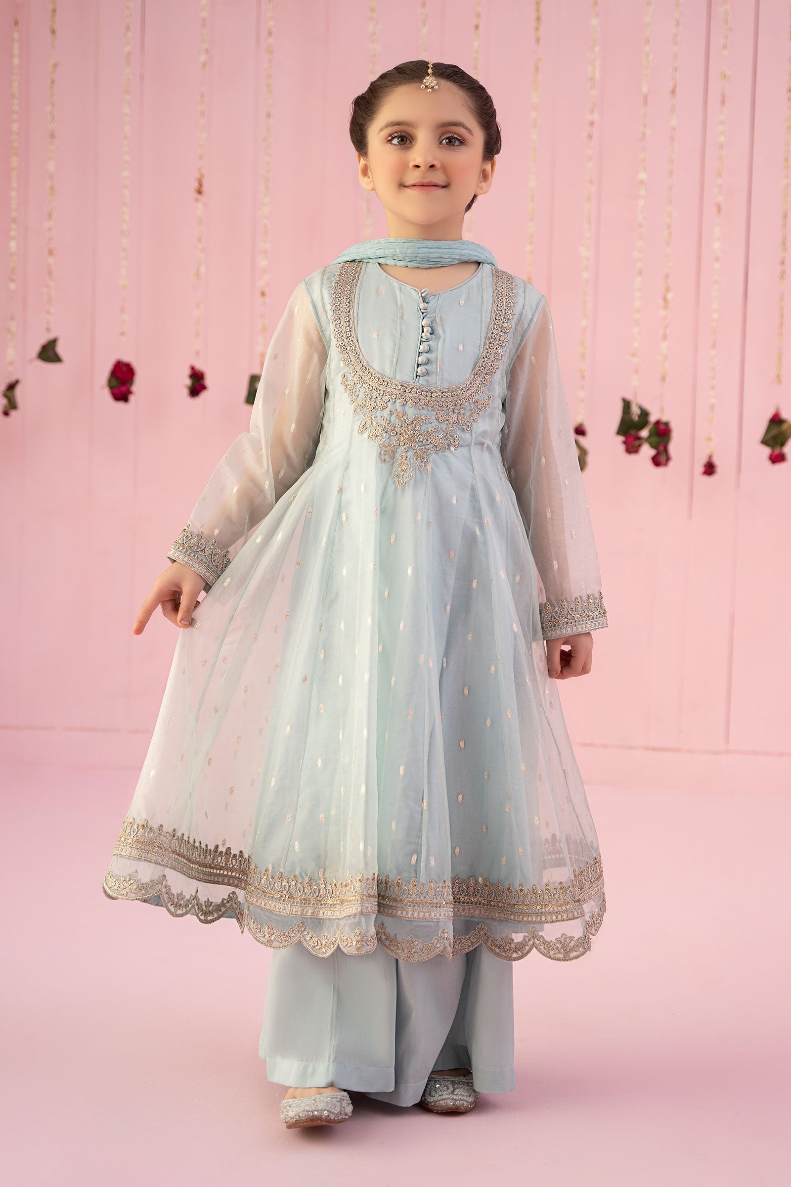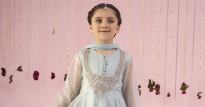 Add sparkle to your little one's festive wardrobe with our 3 piece lurex organza suit; featuring a sequin-tilla embroidered panel frock adorned with fabric buttons and paired with dhaka trousers and kiran laced crushed dupatta.