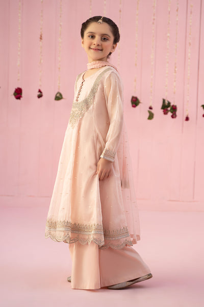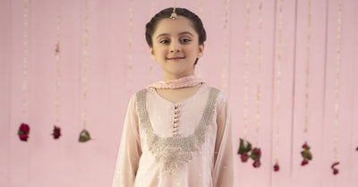 Add sparkle to your little one's festive wardrobe with our 3 piece lurex organza suit; featuring a sequin-tilla embroidered panel frock adorned with fabric buttons and paired with dhaka trousers and kiran laced crushed dupatta.