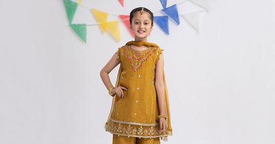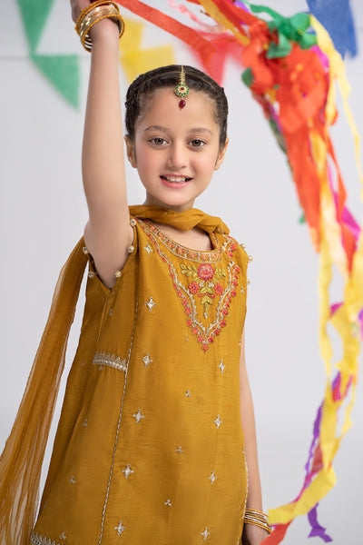 Adding a sense of sophistication to your little one's festivities with our 3 piece embroidered raw silk suit; featuring a sleeveless A-line shirt adorned with organza embroidered border and tilla balls embellishment and paired with dyed gharara and kiran-laced crushed dupatta that gracefully styles all your occasions.
