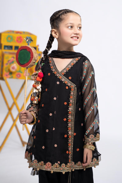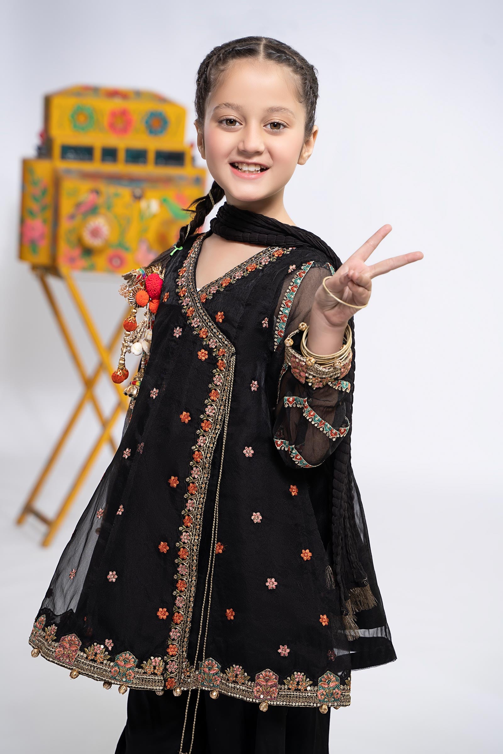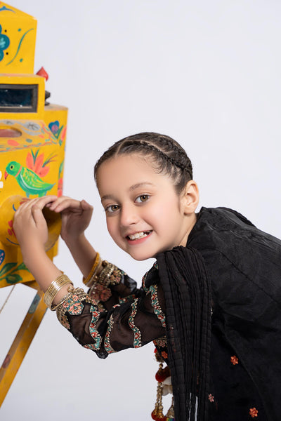 Let your little one captivate with our 3 piece embroidered organza suit; featuring a sequin-tilla embroidered angrakha shirt embellished with fancy tassels and tilla balls and paired with dhaka trousers framed with sequin-tilla embroidery on hem and kiran-laced crushed dupatta.