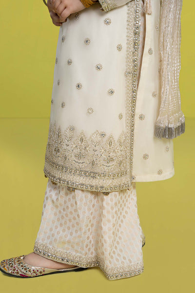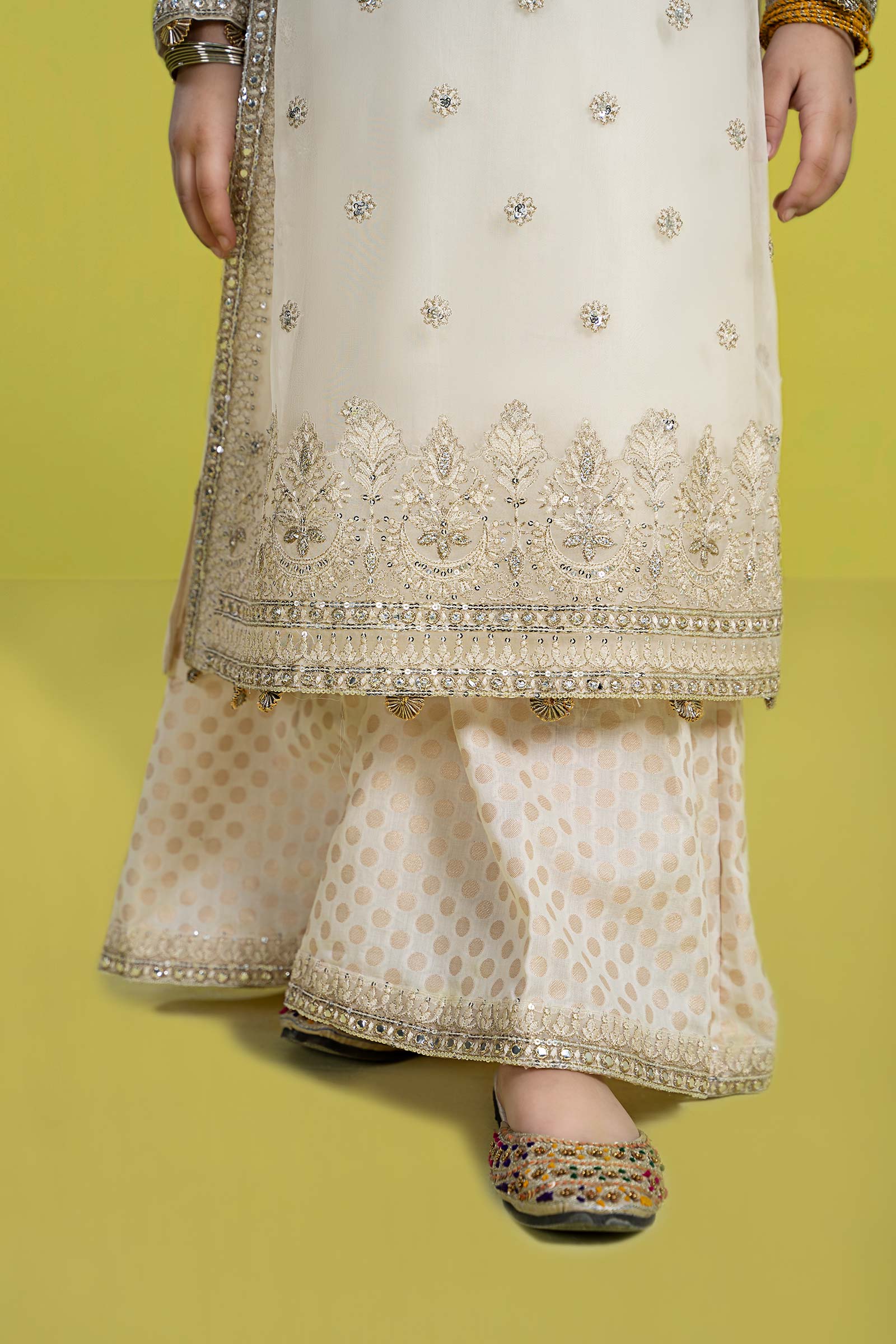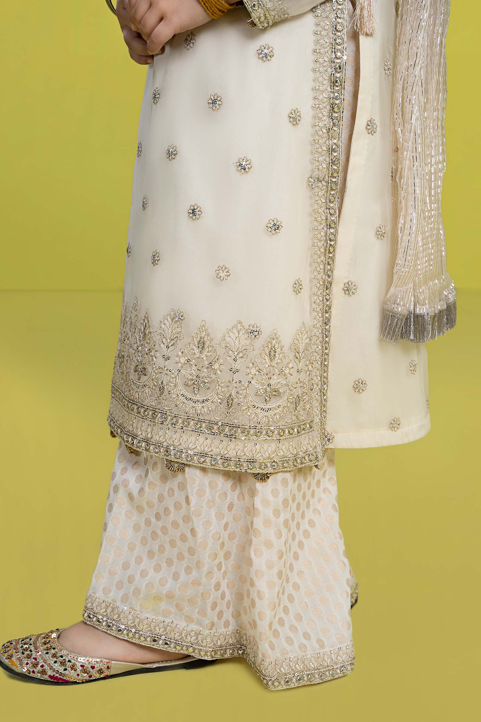 Ensuring timeless allure with our 3 piece embroidered organza suit; featuring a side open shirt adorned with sequin-tilla embroidery, gotta detailing, and tassels and paired with dhaka trousers detailed with sequin-tilla embroidery and kiran-laced crushed dupatta.