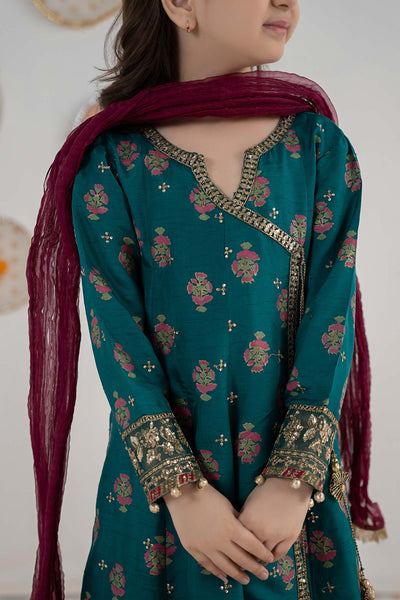 Delve into festive allure with our 3 piece embroidered raw silk suit; featuring an angrakha frock intricately framed with sequin-tilla embroidery and paired with dhaka trousers and kiran-laced crushed dupatta, making it a statement choice for all your summer festivities.