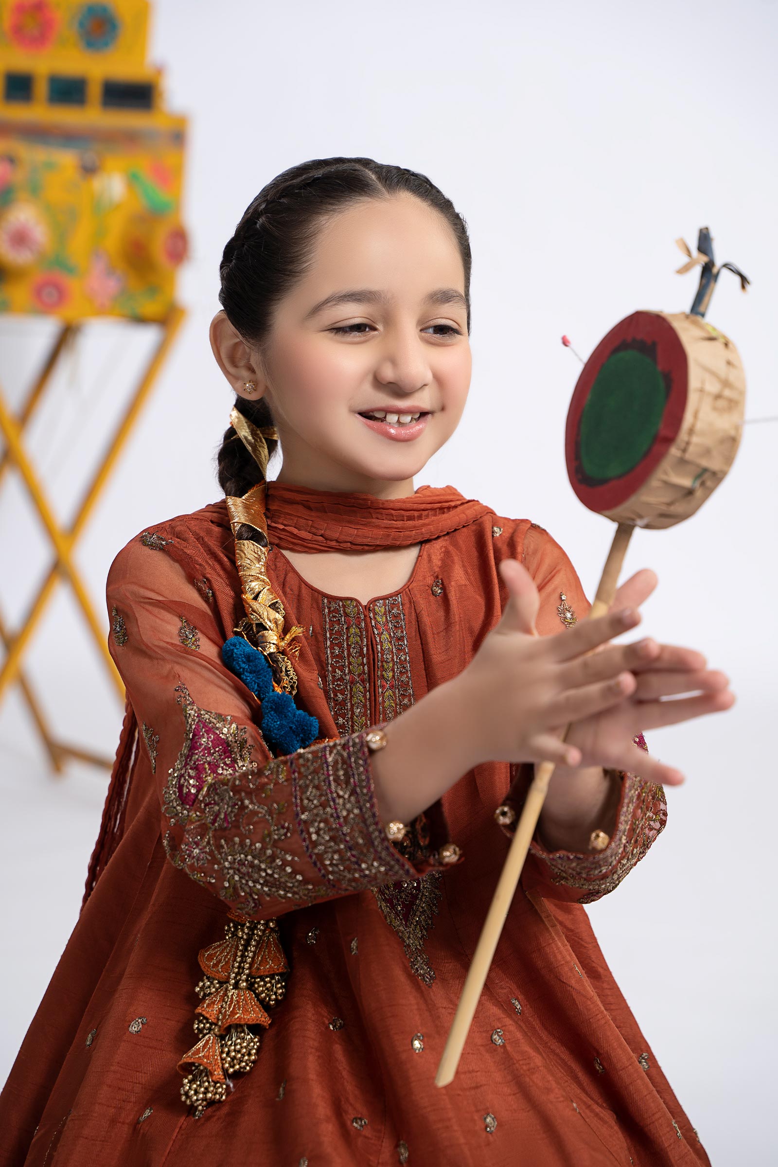 Luminate your little one's festivities with our 3 piece embroidered raw silk suit; featuring a delicately sequin-tilla embroidered frock with tilla balls embellishment. Paired with dhaka trousers with sequin-tilla embroidery on the hem and a kiran-laced crushed dupatta, this sophisticated design is perfect to style all your soirees. Shirt Color: RustFabric: Raw SilkTrousersColor: RustFabric: Raw SilkDupatta Color: Rust Fabric: ChiffonNote: Only Dry Clean