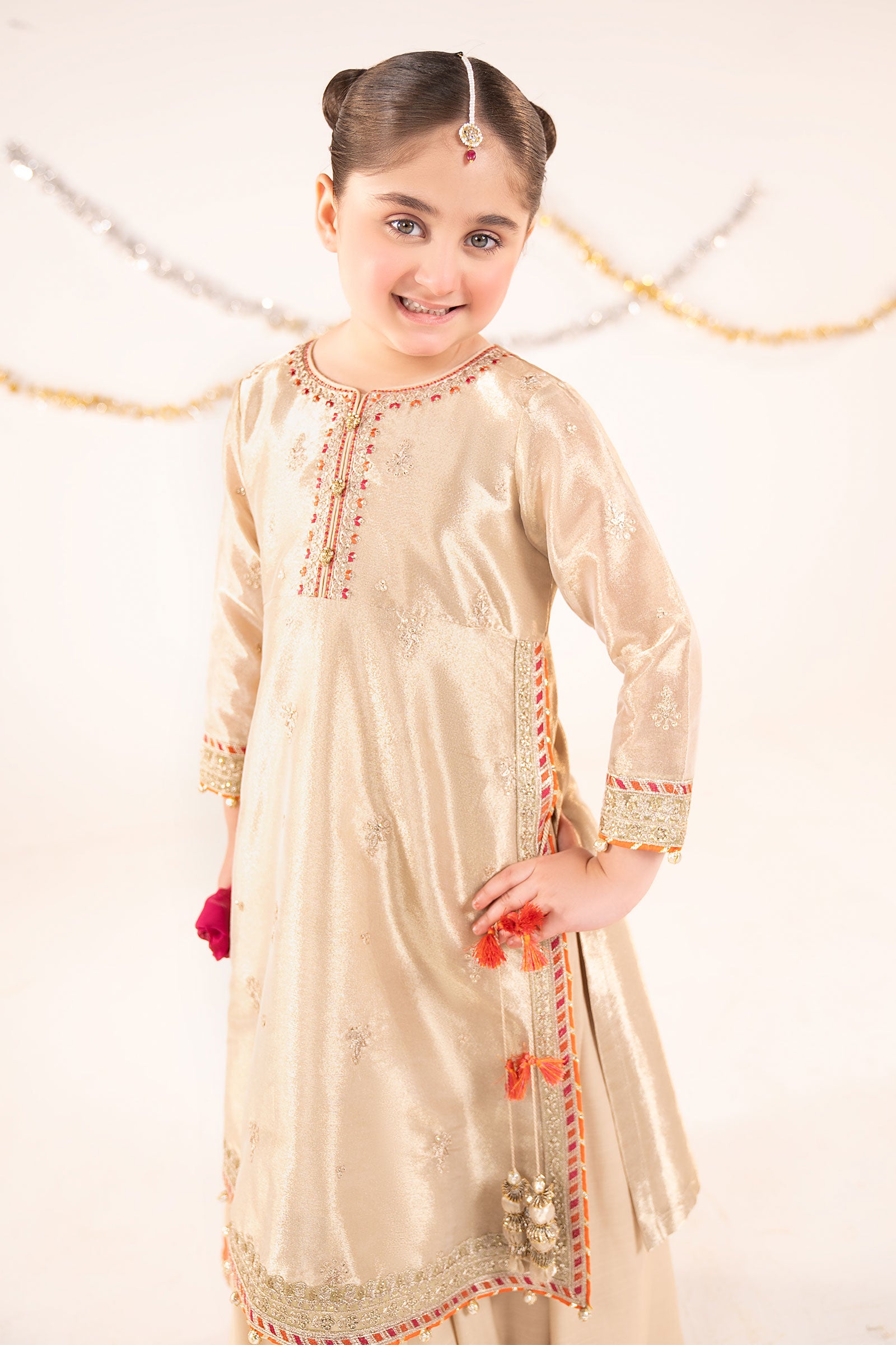 ShirtSpray Embroidered ShirtEmbroidered NecklineEmbroidered Side Seams & BorderEmbroidered SleevesGotta Ball Drops On Sleeves & BorderSleeveless Resham Cotton Undershirt (Attached)Color: GoldenFabric: TissueShararaSolid ShararaElasticated WaistbandGotta Lace BorderColor: GoldenFabric: Raw SilkDupattaSolid DupattaGotta Lace BordersColor: Pink & RustFabric: ChiffonWork Details: Sequin, Tilla & Thread EmbroideryModel is wearing 6-8 sizeNote: Dry Clean Only