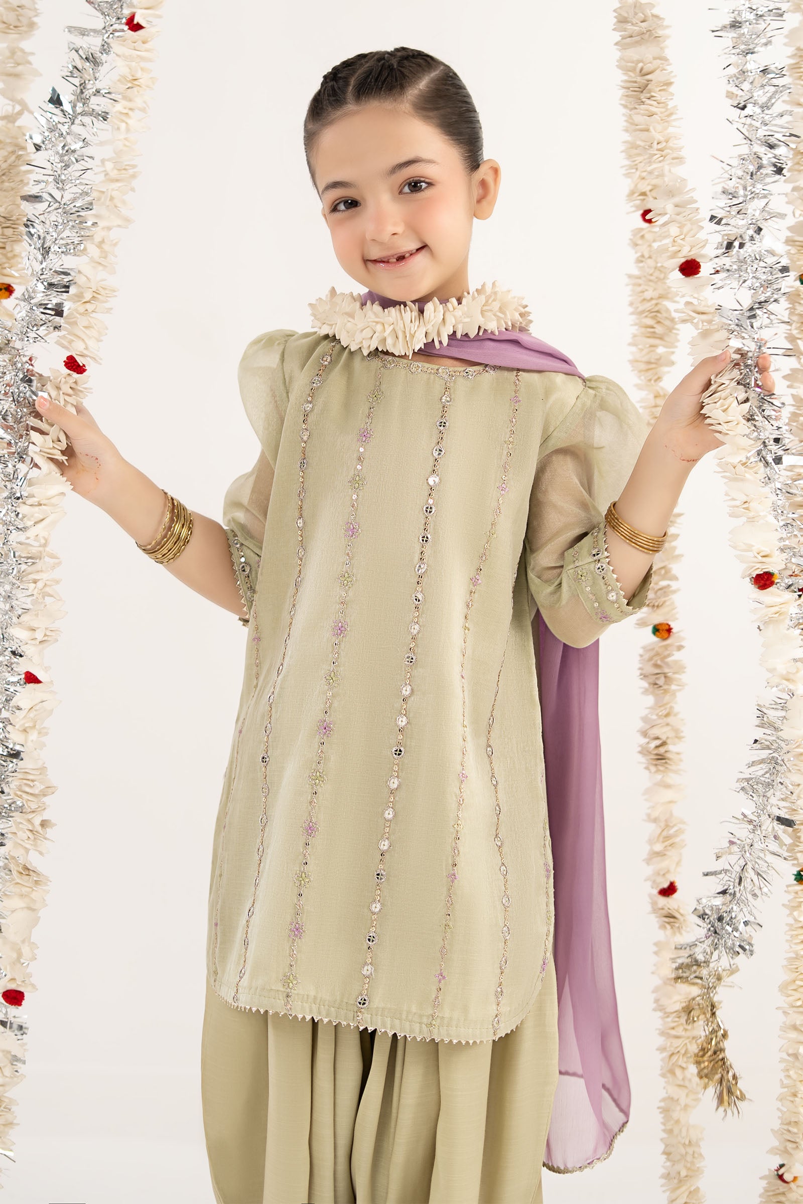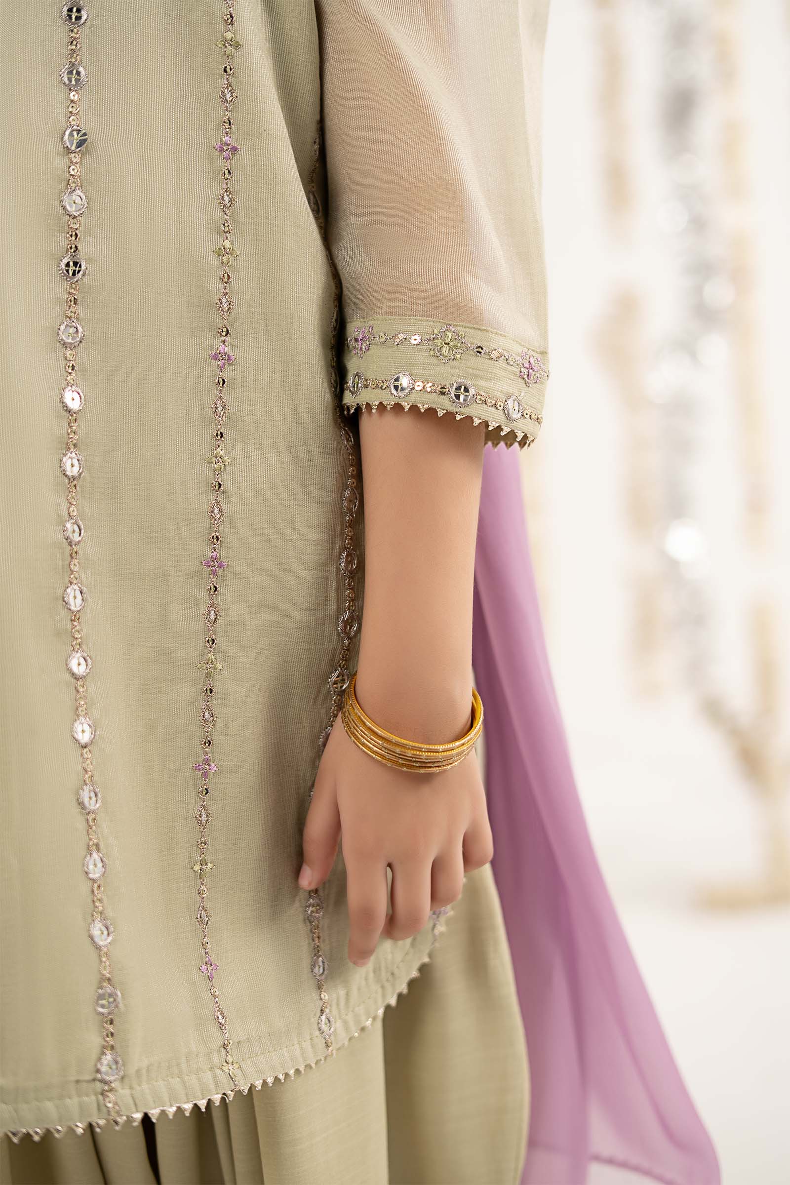 ShirtEmbroidered ShirtEmbroidered Round Neckline Puffed Sleeves With Embroidered BorderRound HemGotta Lace On Side Seams, Border & SleevesSleeveless Resham Cotton Undershirt (Attached)Color: GreenFabric: MasooriShalwarPatyala ShalwarElasticated WaistbandColor: GreenFabric: Raw SilkDupattaSolid DupattaFour-Side Lace BorderColor: PurpleFabric: ChiffonModel is wearing 6-8 sizeNote: Dry Clean Only