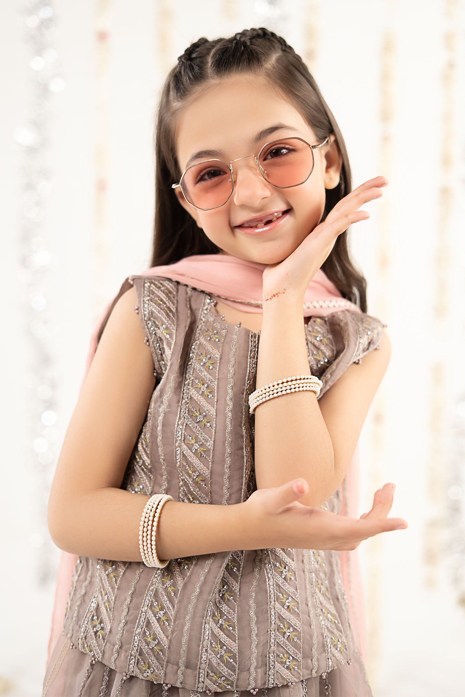 BlouseSleeveless Embroidered Blouse With Gotta DetailingRound NecklinePearl Detailing On Neckline, Armhole & BorderResham Cotton Lining (Attached)Color: LilacFabric: OrganzaLehengaEmbroidered LehengaElasticated WaistbandEmbroidered BorderResham Cotton Lining (Attached)Color: LilacFabric: OrganzaDupattaSolid DupattaFour-Side Gotta Lace BorderColor: PeachFabric: ChiffonWork Details: Sequin, Tilla & Thread EmbroideryModel is wearing 6-8 sizeDisclaimer: Separate sleeves included.Note: Dry Clean Only