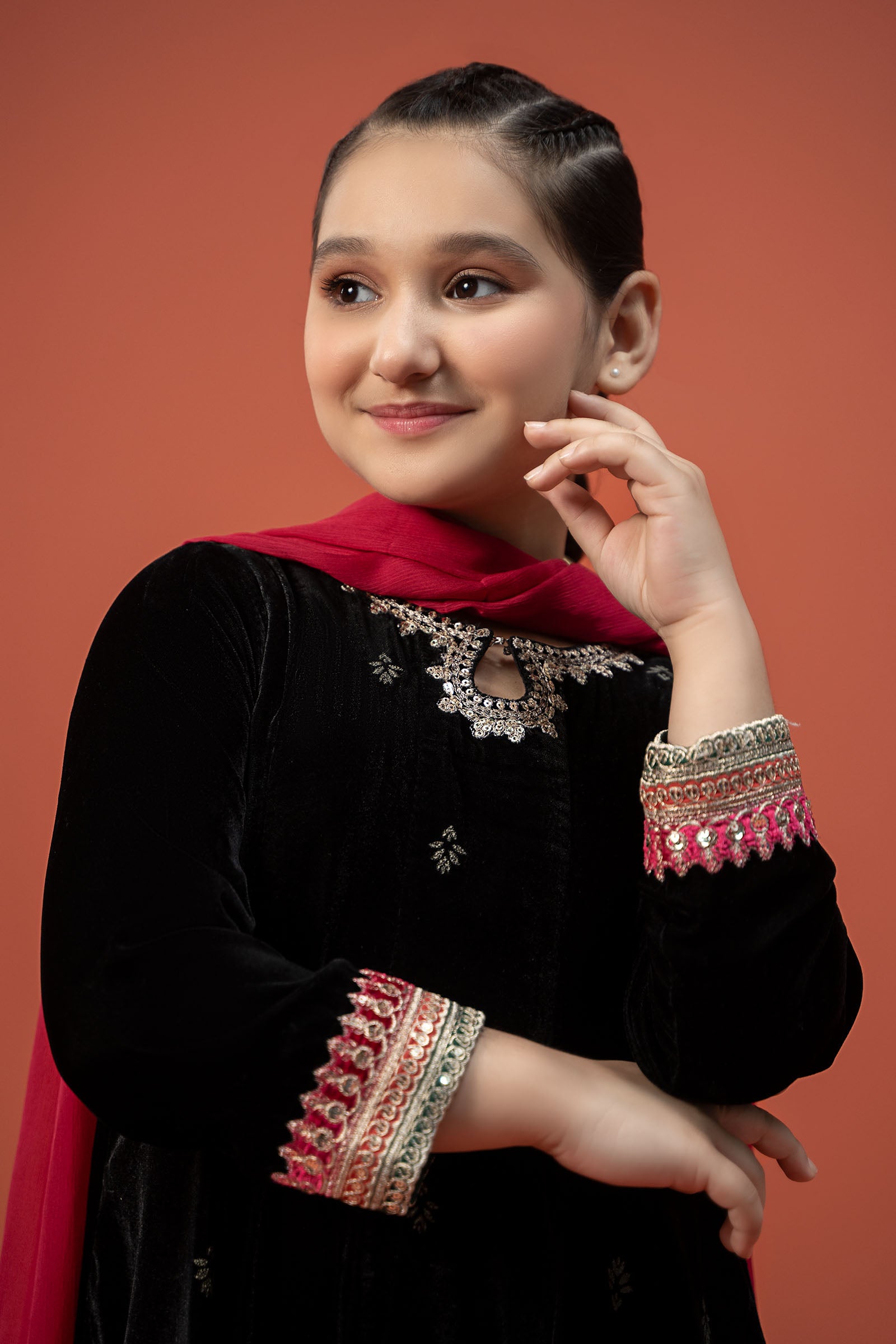 ShirtEmbroidered Round NecklineDyed Spray Embroidered FrontEmbroidered Organza BorderFull Sleeves With Embroidered BorderGotta Balls Detailing On Sleeves & BorderFit: RegularColor: BlackFabric: VelvetTrousersDyed Dhaka TrousersElasticated WaistbandEmbroidered HemFit: RelaxedColor: PinkFabric: Raw SilkDupatta Dyed DupattaKiran Lace BordersColor: PinkFabric: ChiffonWork Details: Sequins, Tilla & Thread Embroidery With Kiran Lace DetailingModel is wearing size 6-8Note: Dry Clean Only