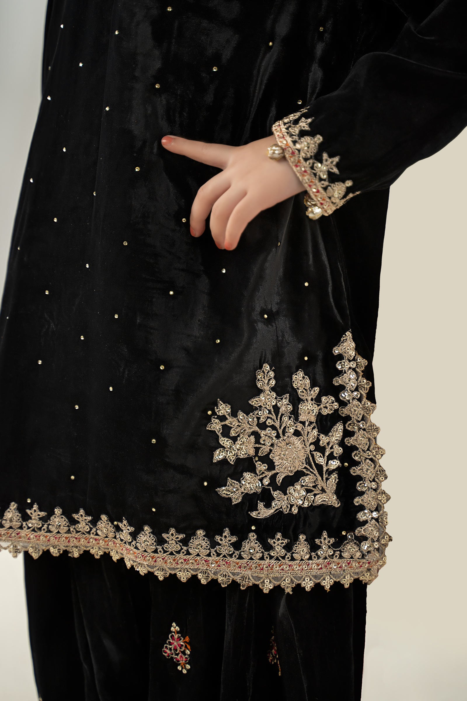 ShirtEmbroidered NecklineDiamantes Embellished FrontEmbroidered Side Seams With Lace DetailingEmbroidered Border With Lace DetailingFloral Embroidered Motif On BorderStraight Sleeves With Embroidery & Gotta Balls Drop Detailing On BorderFit: RegularColor: BlackFabric: VelvetShalwarEmbroidered ShalwarElasticated WaistbandFit: RegularColor: BlackFabric: VelvetDupattaDyed DupattaFour-Side Gotta Lace DetailingColor: MultiFabric: ChiffonWork Details: Sequins, Tilla & Thread EmbroideryModel is wearing 6-8 sizeNote: Dry Clean Only