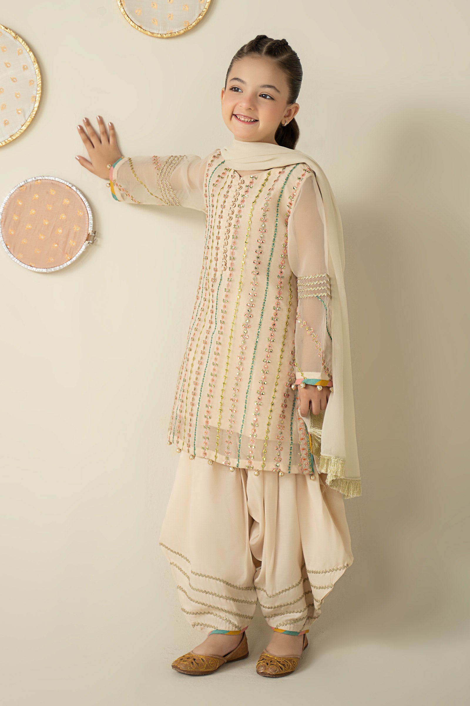 ShirtEmbroidered ShirtRound Neckline With Loop-Buttons DetailingStraight Sleeves With Gotta Lace, Chatta Patti & Embroidered BorderGotta Balls Drop Detailing On Sleeves & BorderDyed Resham Cotton Sleeveless Lining (Attached)Fit: RegularColor: Off-WhiteFabric: OrganzaShalwarDhoti ShalwarElasticated WaistbandGotta Lace & Chatta Patti Detailing On BorderFit: RegularColor: Off-WhiteFabric: Raw SilkDupattaDyed DupattaTwo-Side Kiran Lace BorderColor: Off-WhiteFabric: ChiffonWork Details: Sequins, Tilla & Thread EmbroideryModel is wearing 6-8 sizeNote: Dry Clean Only