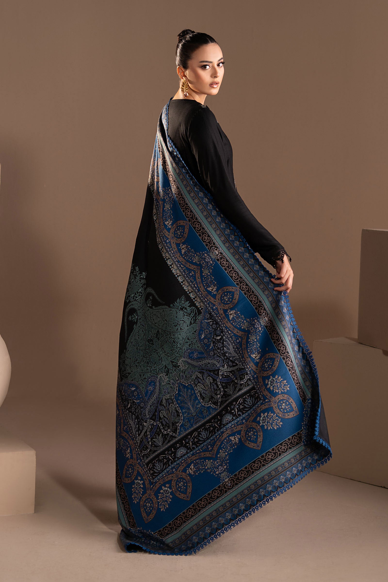 Color: BlackShirtEmbroidered A-Line ShirtEmbroidered NecklineFitted SleevesLace & Pearl Drops On Sleeves & BorderFabric: Twill LinenShalwarSolid ShalwarElasticated WaistbandEmbroidered BorderFabric: LinenShawlPrinted ShawlFour-Sided Lace BorderFabric: WoolNote: Dry Clean Only