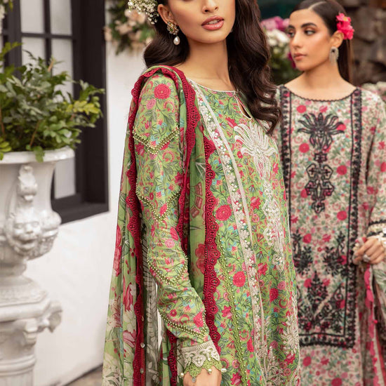 Shirt Printed Lawn Embroidered Front Printed Lawn Back & Sleeves Embroidered PattiTrousers Printed Cambric TrouserDupatta Printed Chiffon Dupatta Color: Green