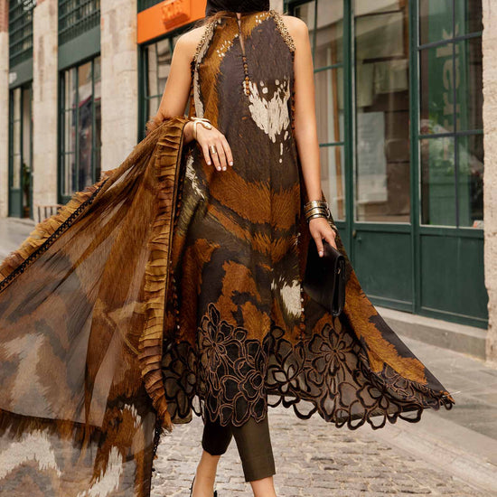 ShirtPrinted ShirtEmbroidered PattiEmbroidered Ghera PattiFabric: CambricColor: BrownDupattaPrinted DupattaFabric: ChiffonColor: BrownTrousersDyed TrousersFabric: CambricColor: BrownNote: Dry Clean Only
