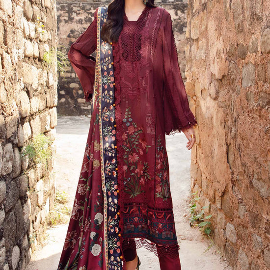 ShirtEmbroidered Center PanelEmbroidered Right & Left PanelsEmbroidered PattiEmbroidered Back & SleevesColor: MaroonFabric: LinenTrouserDyed TrouserColor: MaroonFabric: LinenShawlPrinted ShawlColor: MaroonFabric: HerringboneNote: Dry Clean Only