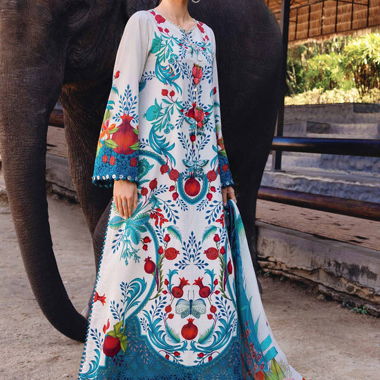 Color: Off-WhiteShirtPrinted Lawn ShirtEmbroidered GheraEmbroidered PattiEmbroidered TasselTrouserPlain Dyed TrouserDupattaPrinted Chiffon DupattaNote: Dry Clean Only