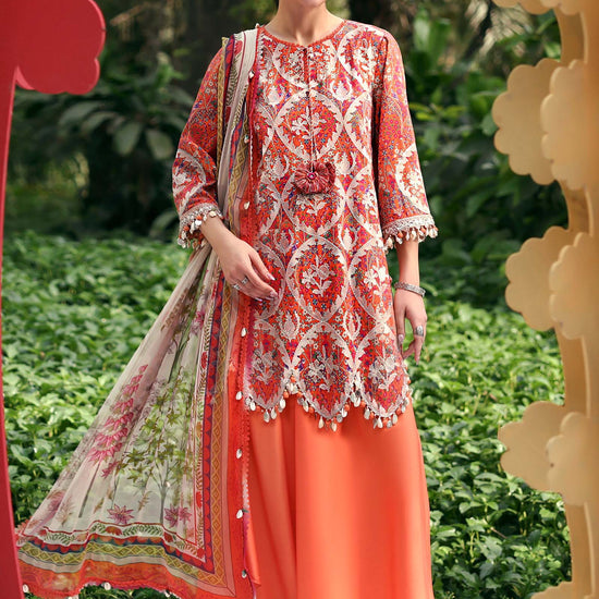 Color: OrangeShirtEmbroidered Printed Lawn FrontPrinted Lawn Back & SleevesEmbroidered Organza PattiTrouserDyed Cambric TrouserDupattaPrinted Chiffon DupattaNote: Dry Clean Only