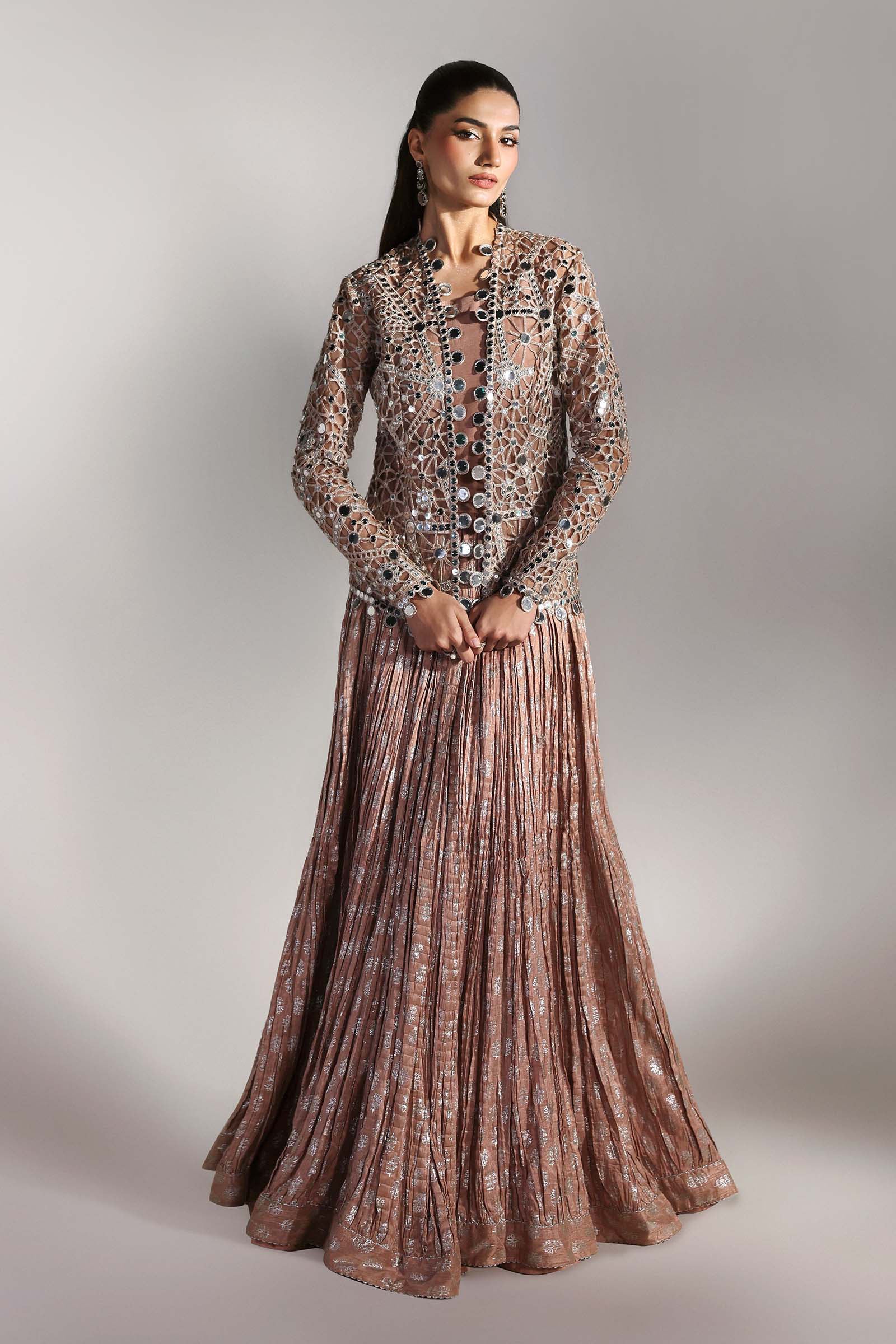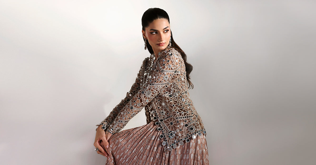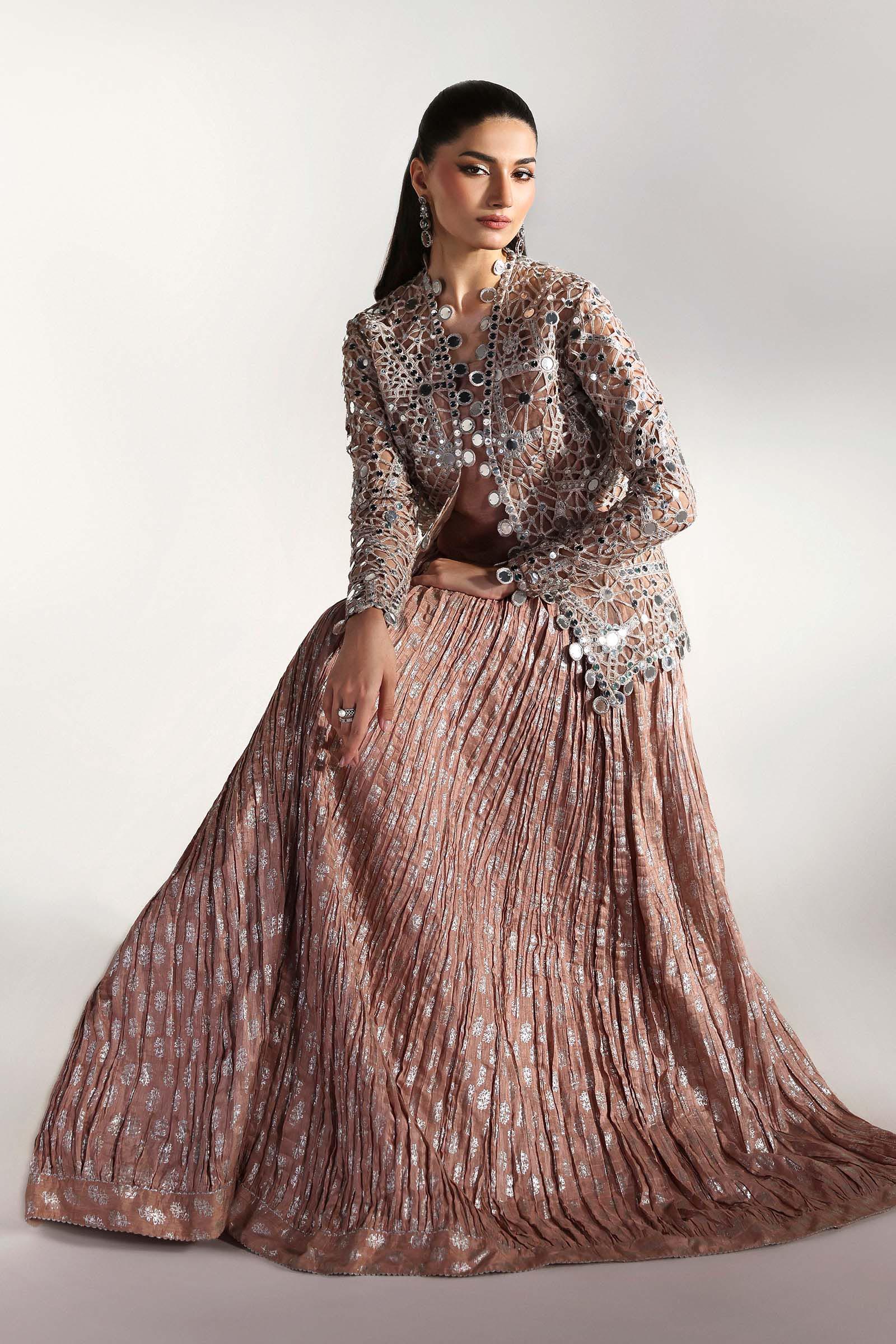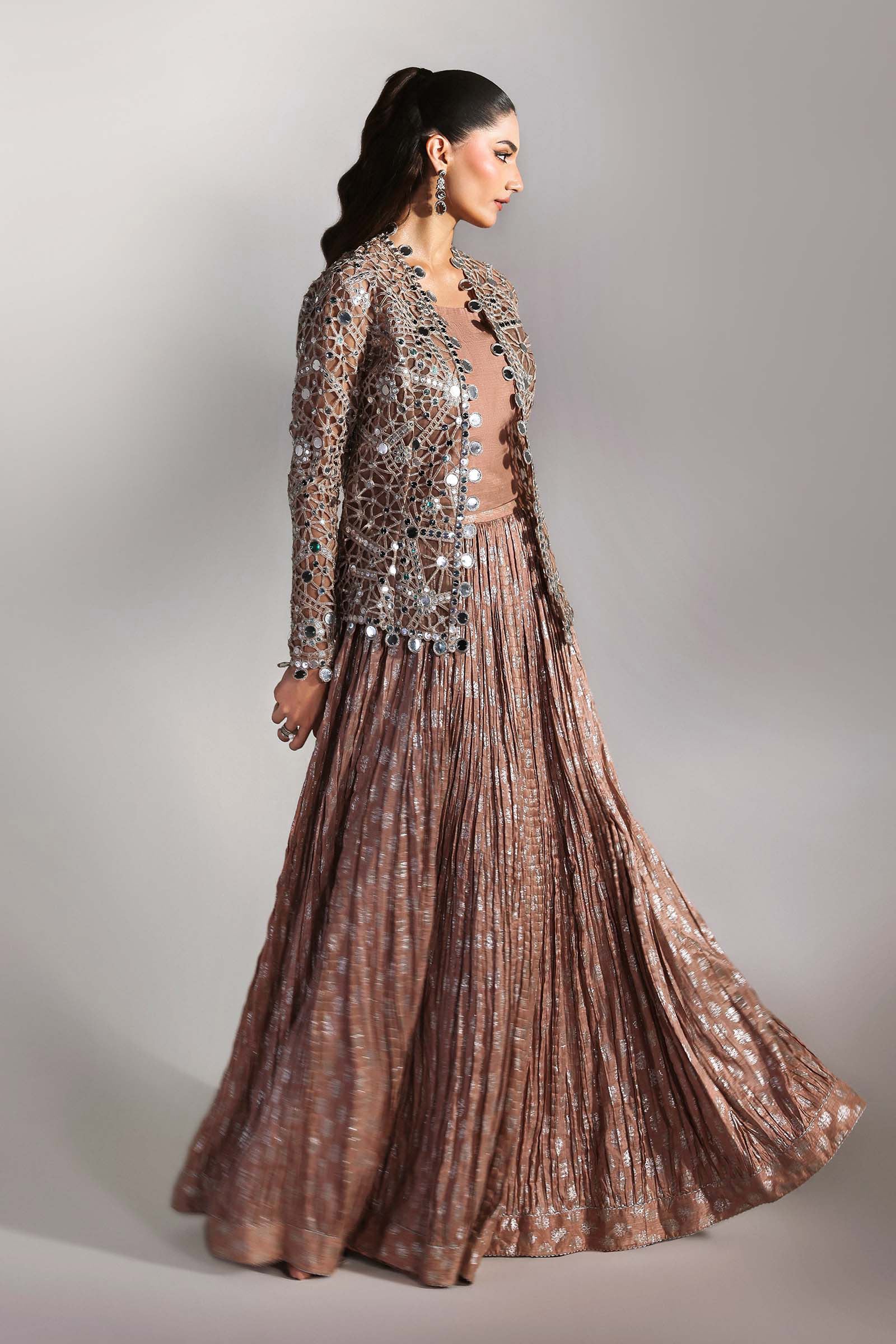 A canvas of timeless artistry and modern grace; this lehenga set unfolds like a couture sonnet. The laser-cut jacket, intricately crafted with an artful amalgamation of sequins, shimmers with quiet opulence, while the solid undershirt anchors its elegance in simplicity. Paired with a crushed, screen-printed lehenga that moves like a dream, it becomes a statement of effortless grandeur where every thread tells a story of poise, poetry, and couture elegance reborn.