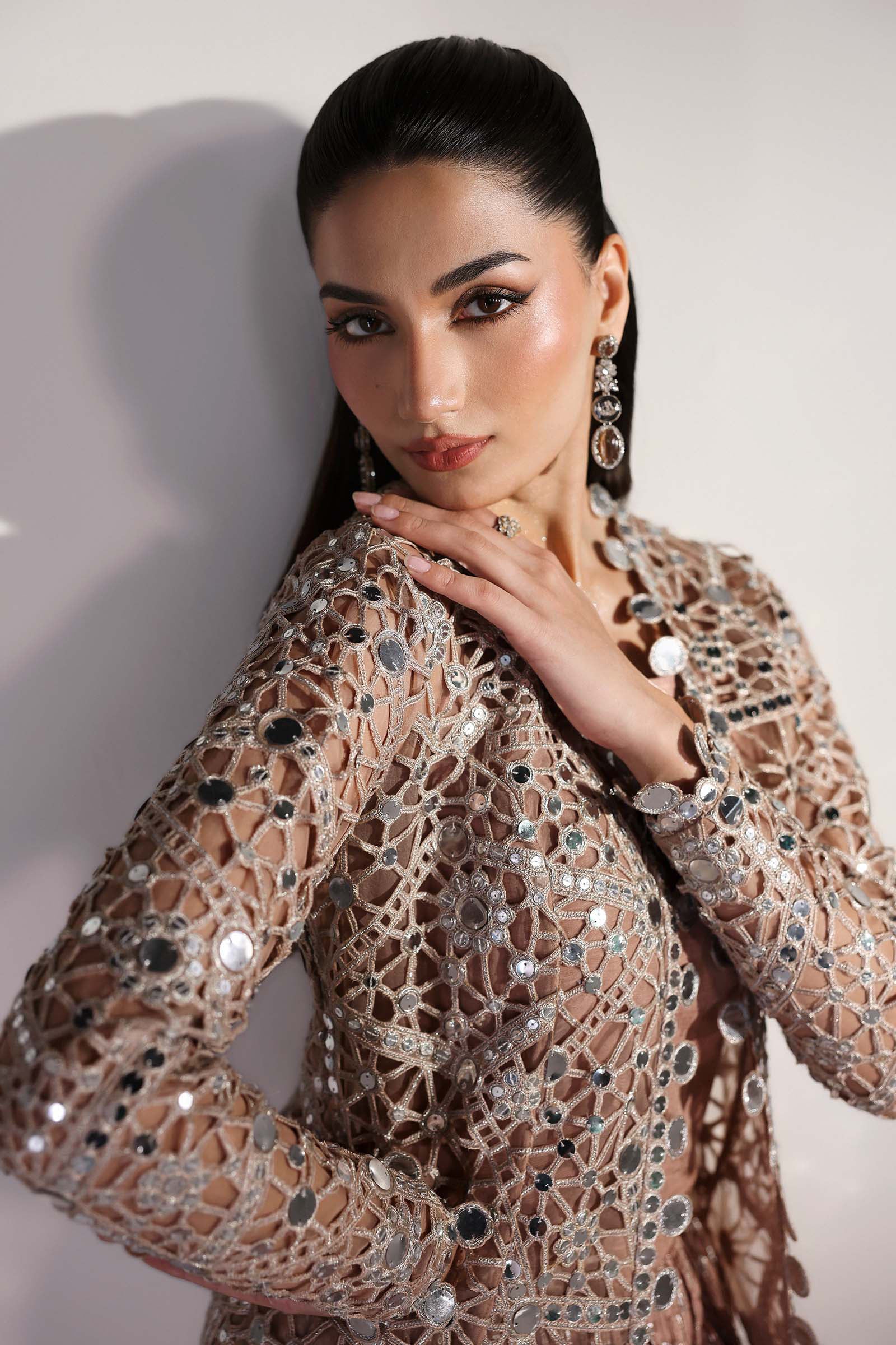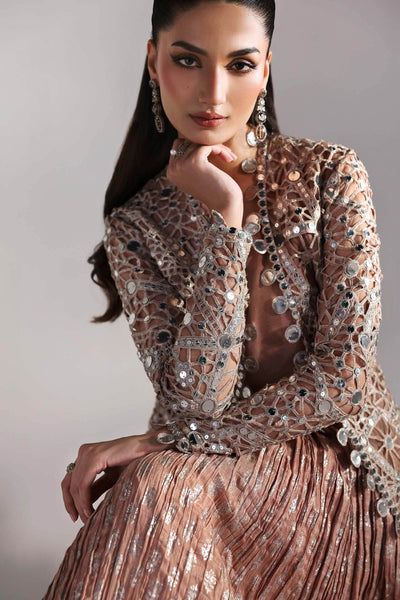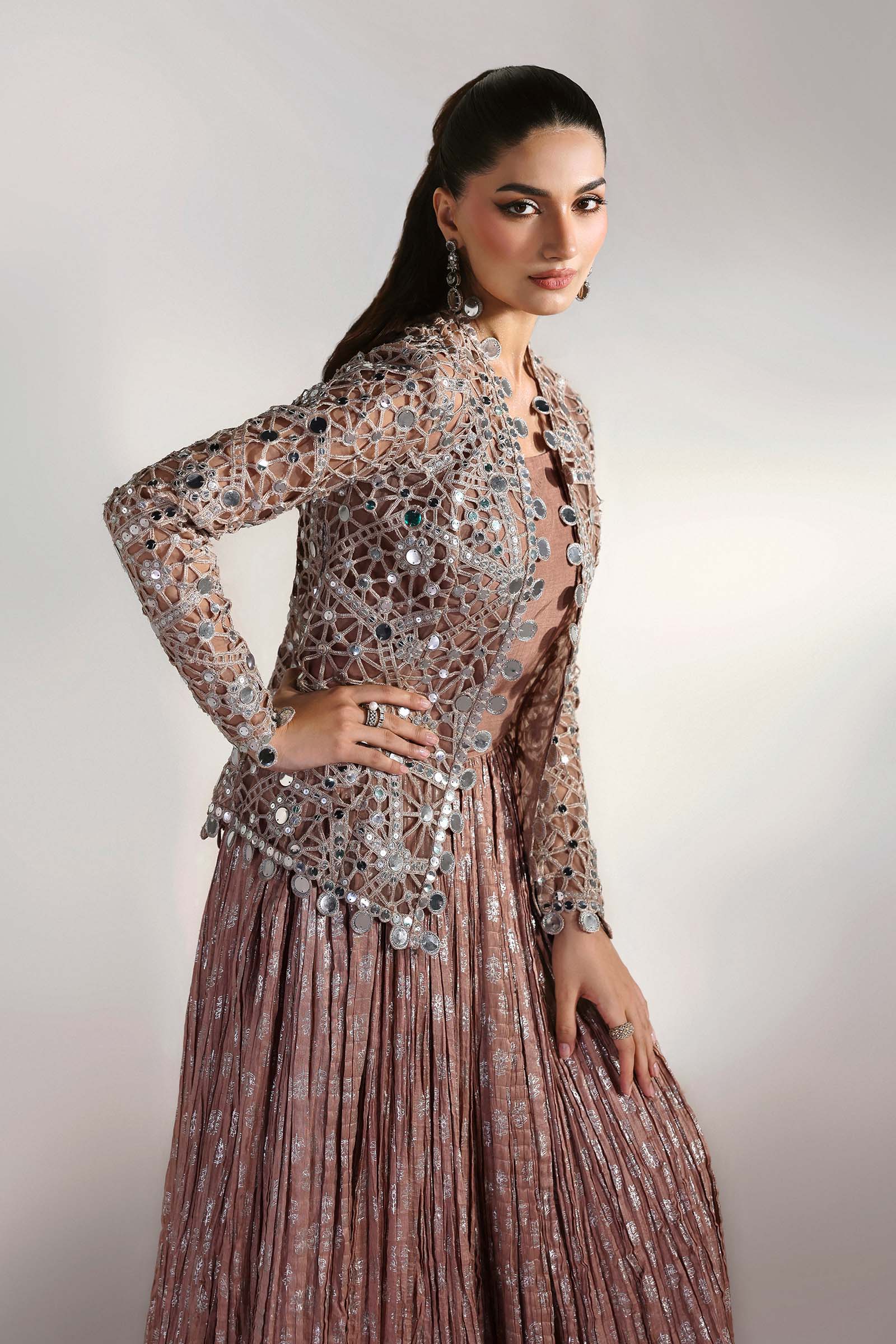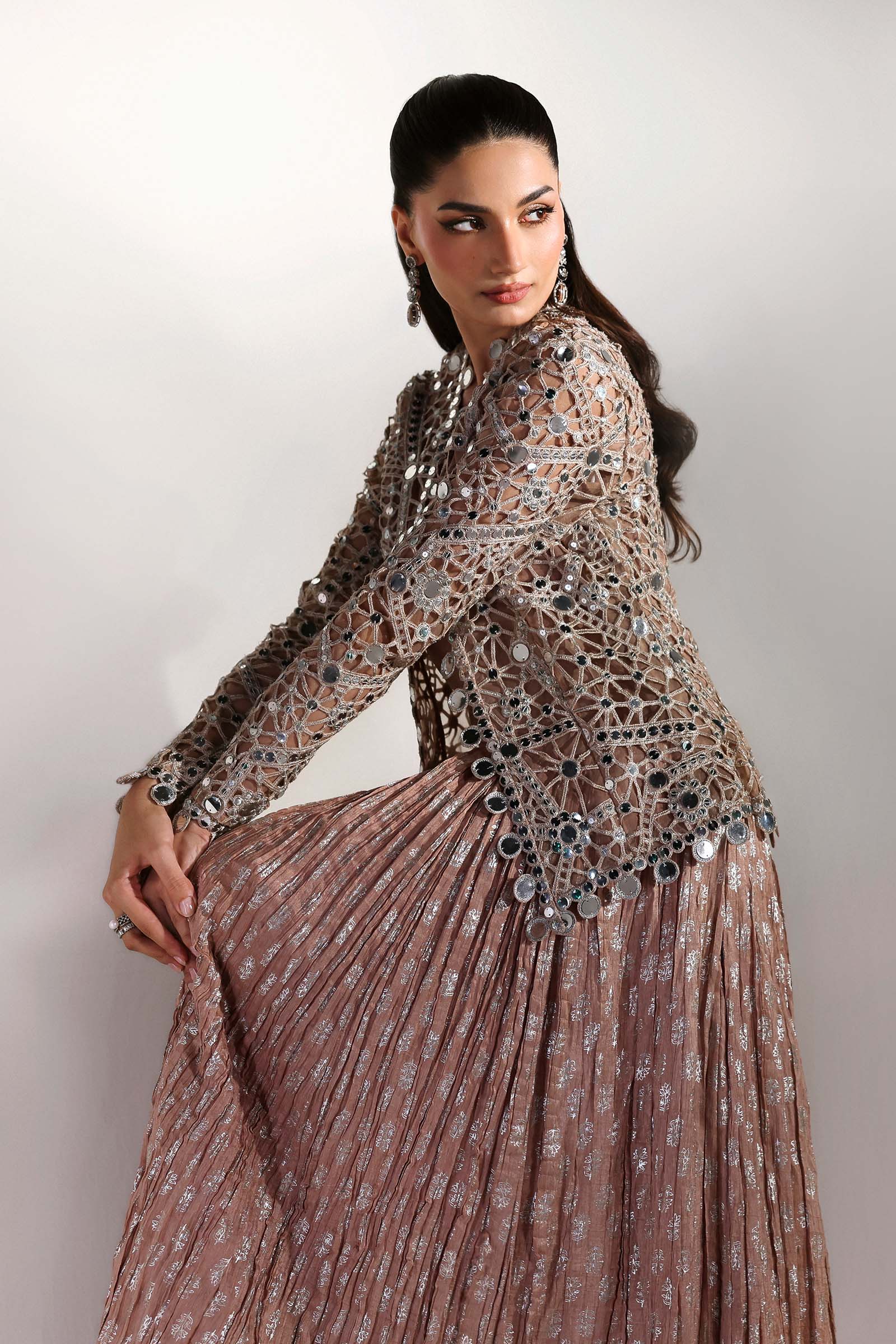 A canvas of timeless artistry and modern grace; this lehenga set unfolds like a couture sonnet. The laser-cut jacket, intricately crafted with an artful amalgamation of sequins, shimmers with quiet opulence, while the solid undershirt anchors its elegance in simplicity. Paired with a crushed, screen-printed lehenga that moves like a dream, it becomes a statement of effortless grandeur where every thread tells a story of poise, poetry, and couture elegance reborn.