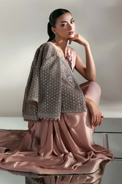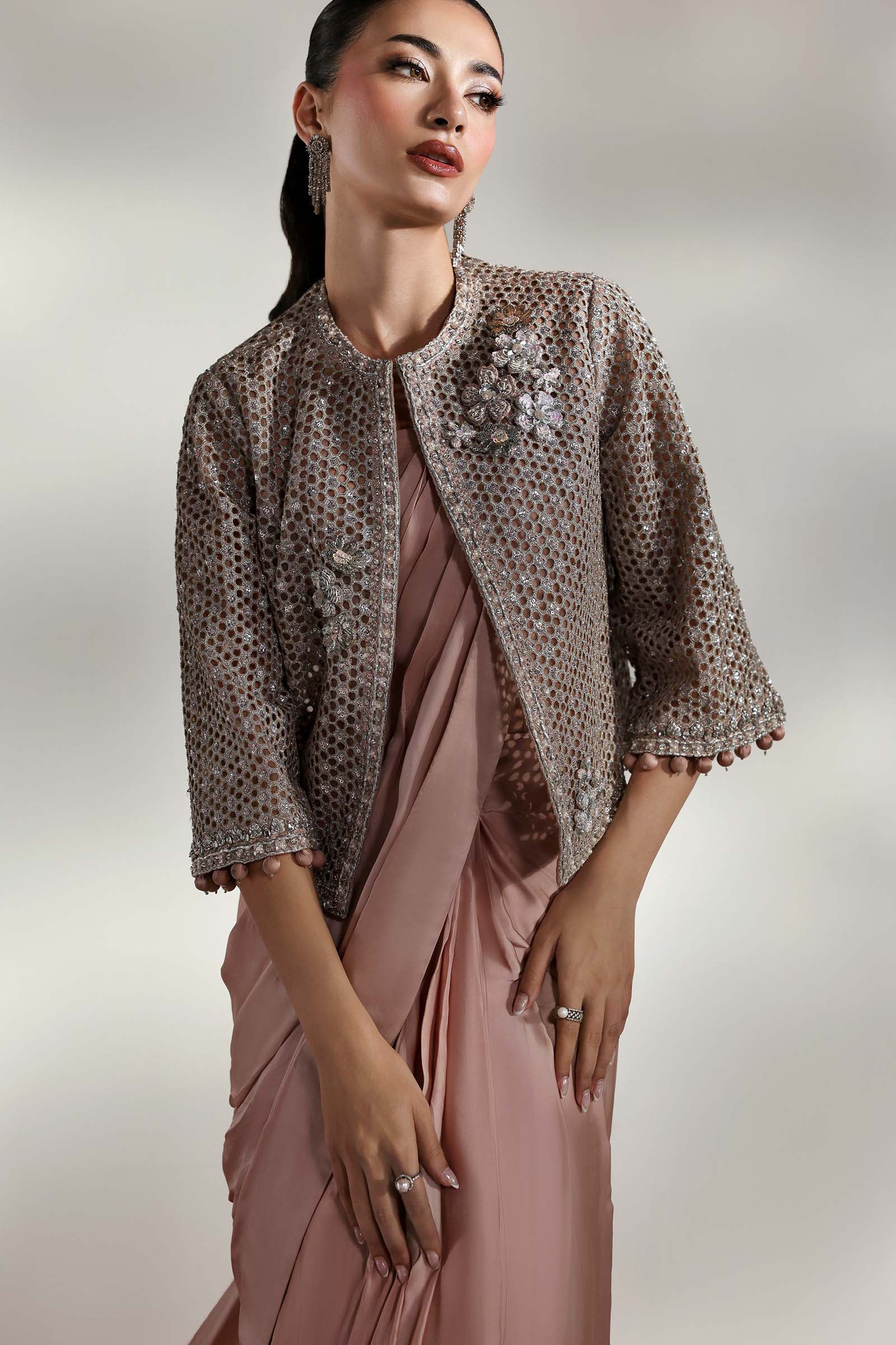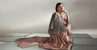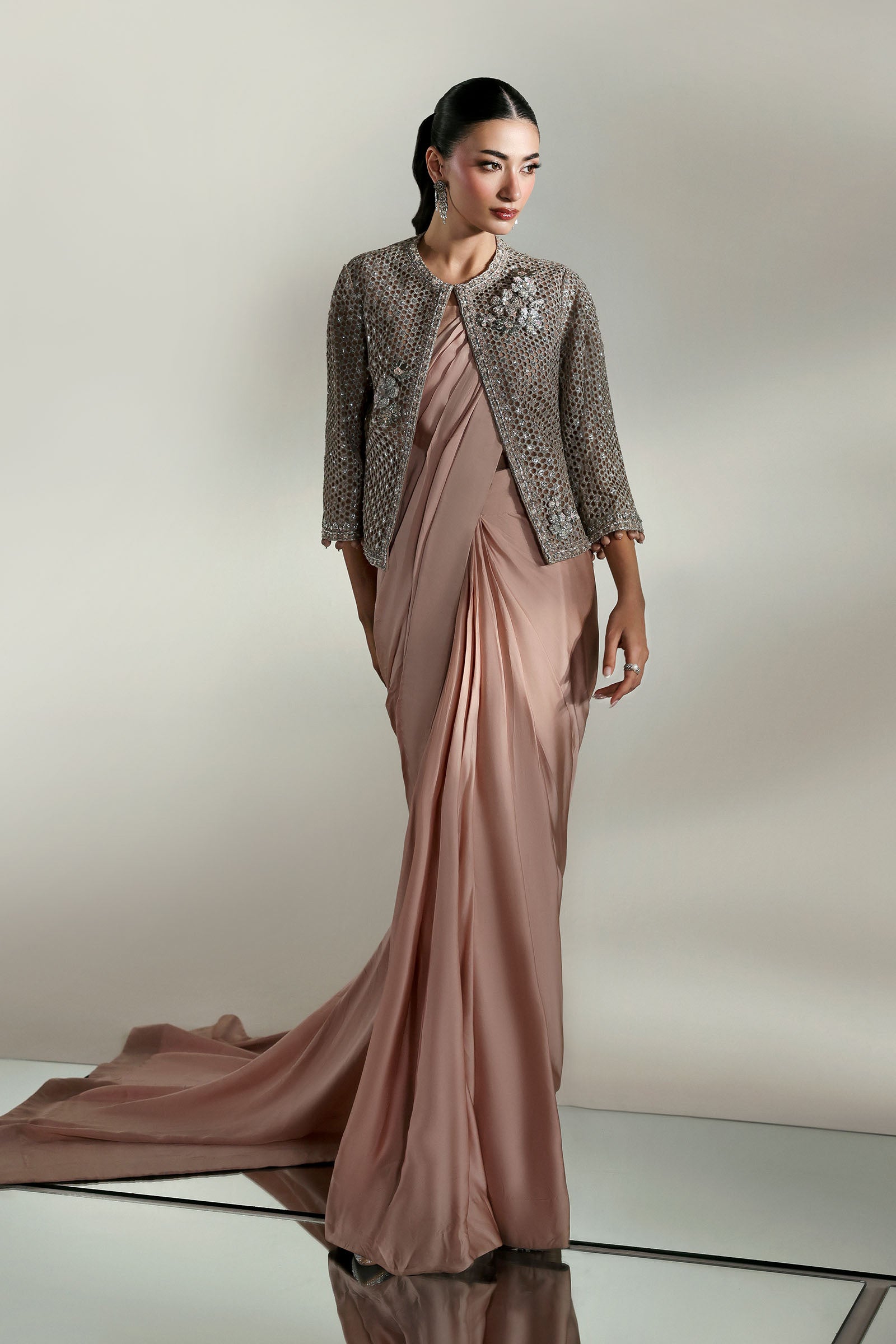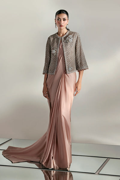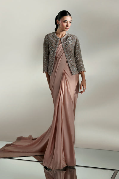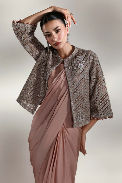 A symphony of elegance unfolds; this couture saree set, sculpted from luxurious charmeuse silk, drapes like liquid. The serene plain canvas whispers quiet sophistication, while the intricately laser-cut embroidered jacket blooms in poetic grandeur, adorned with delicate 3D florals and finished with ball-drop detailing on sleeves border that sways to every movement. A timeless ode to femininity, where minimalism meets majesty in the language of couture.