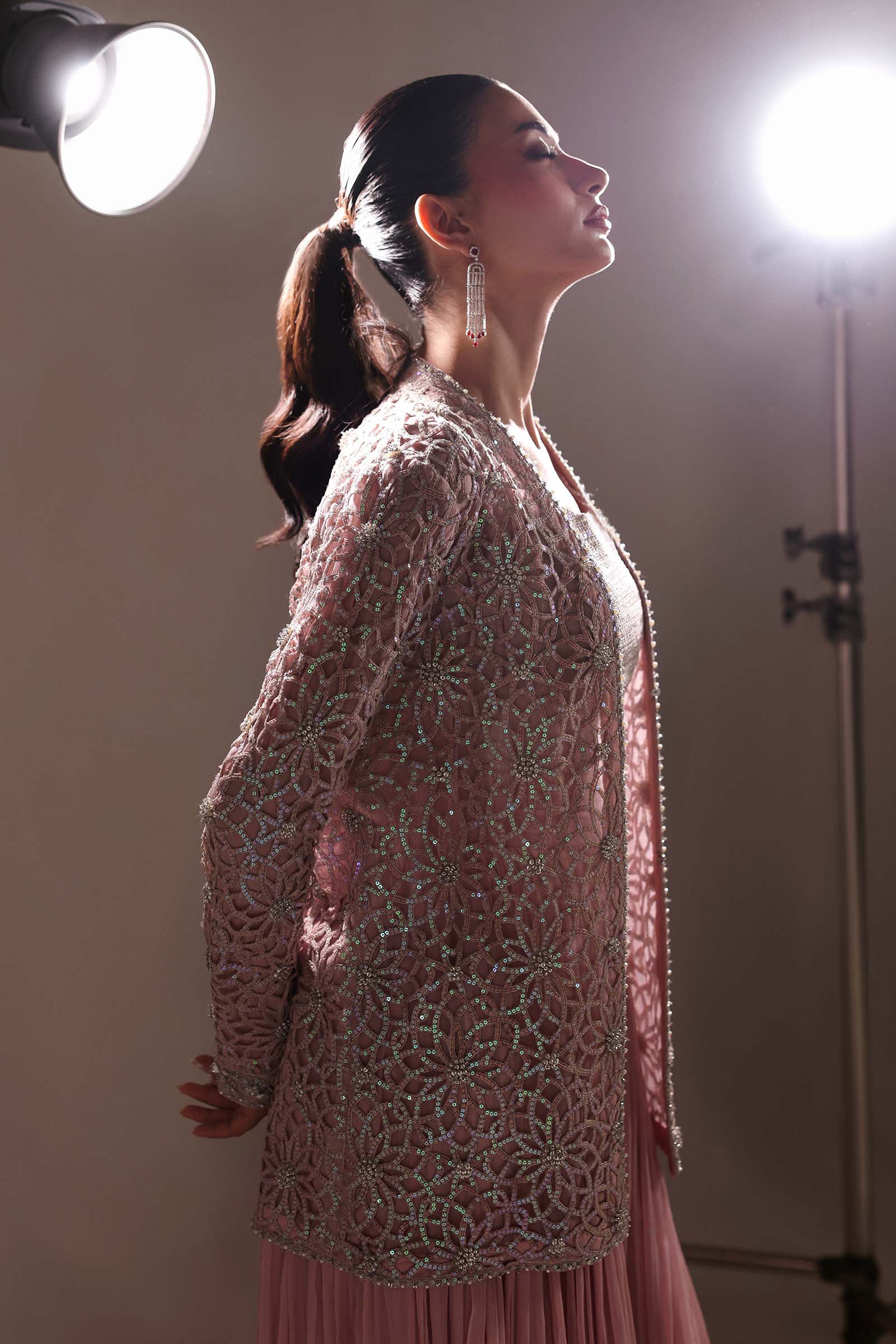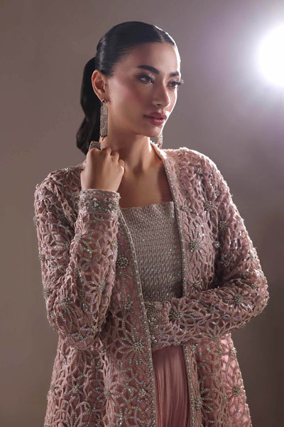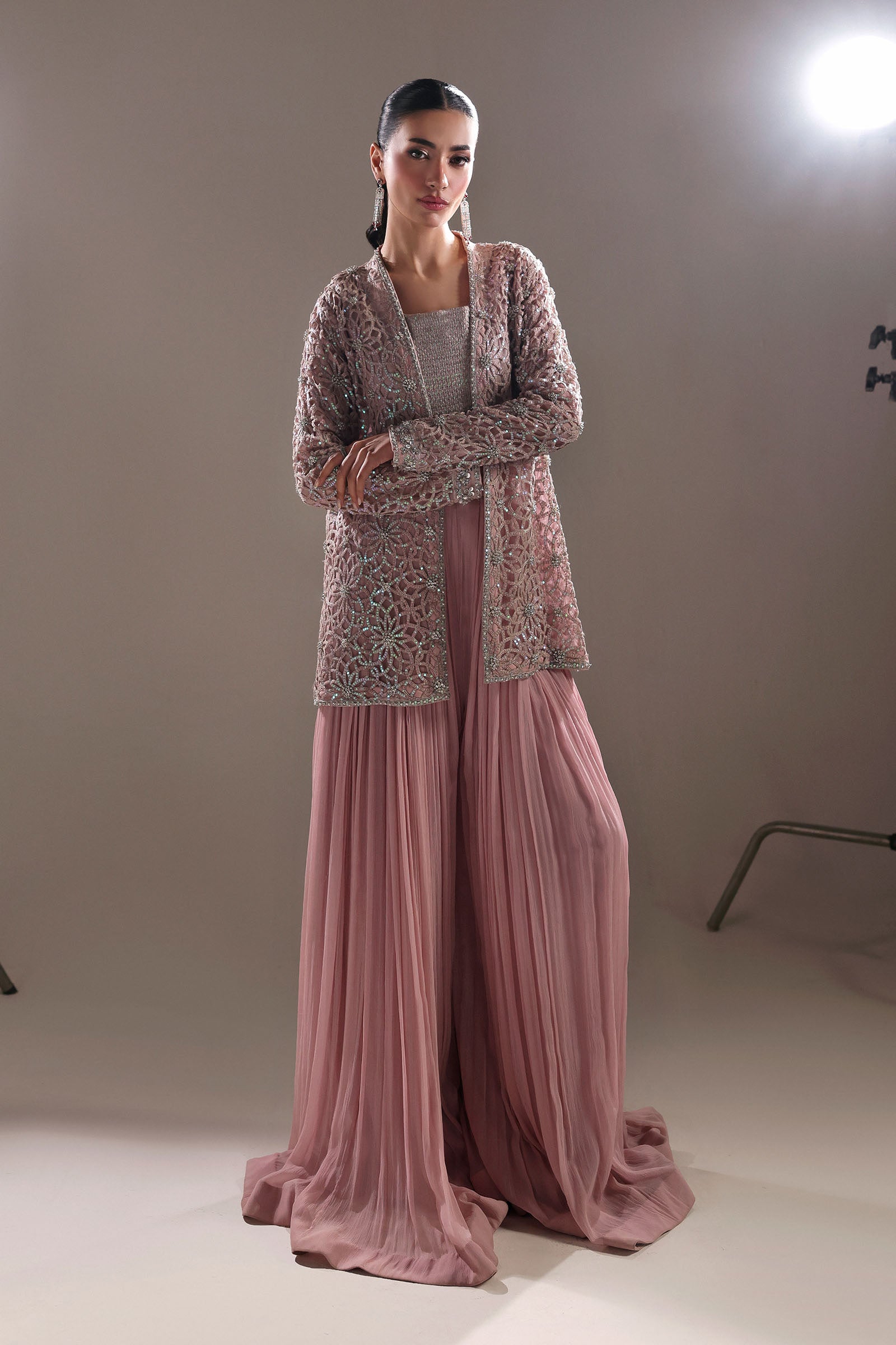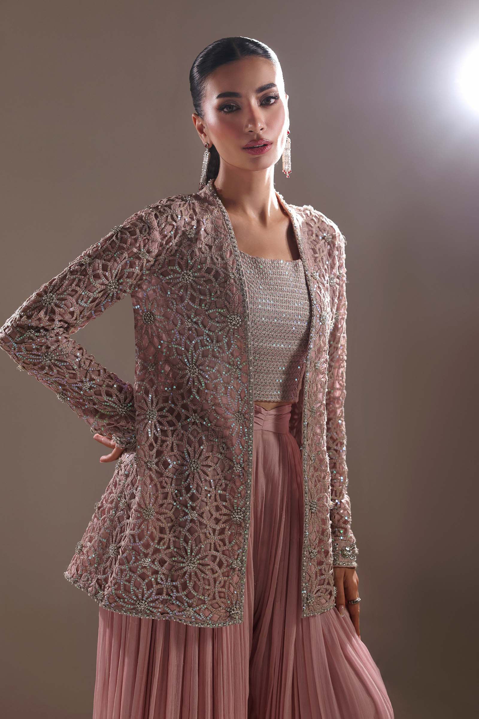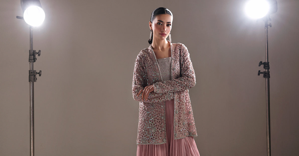 Where couture meets poetry, this sharara set is a canvas of modern grandeur and timeless grace. The delicately designed sequin-embellished blouse shimmers with celestial allure, while the long flowing sharara cascades in a modern fall, sculpting movement into art. Draped in finesse, the intricately crafted laser-embroidered jacket glows with sequin accents, each stitch narrating a tale of heritage reborn. A masterpiece of luminous textures and refined romance, crafted for the modern muse who reigns in quiet opulence.