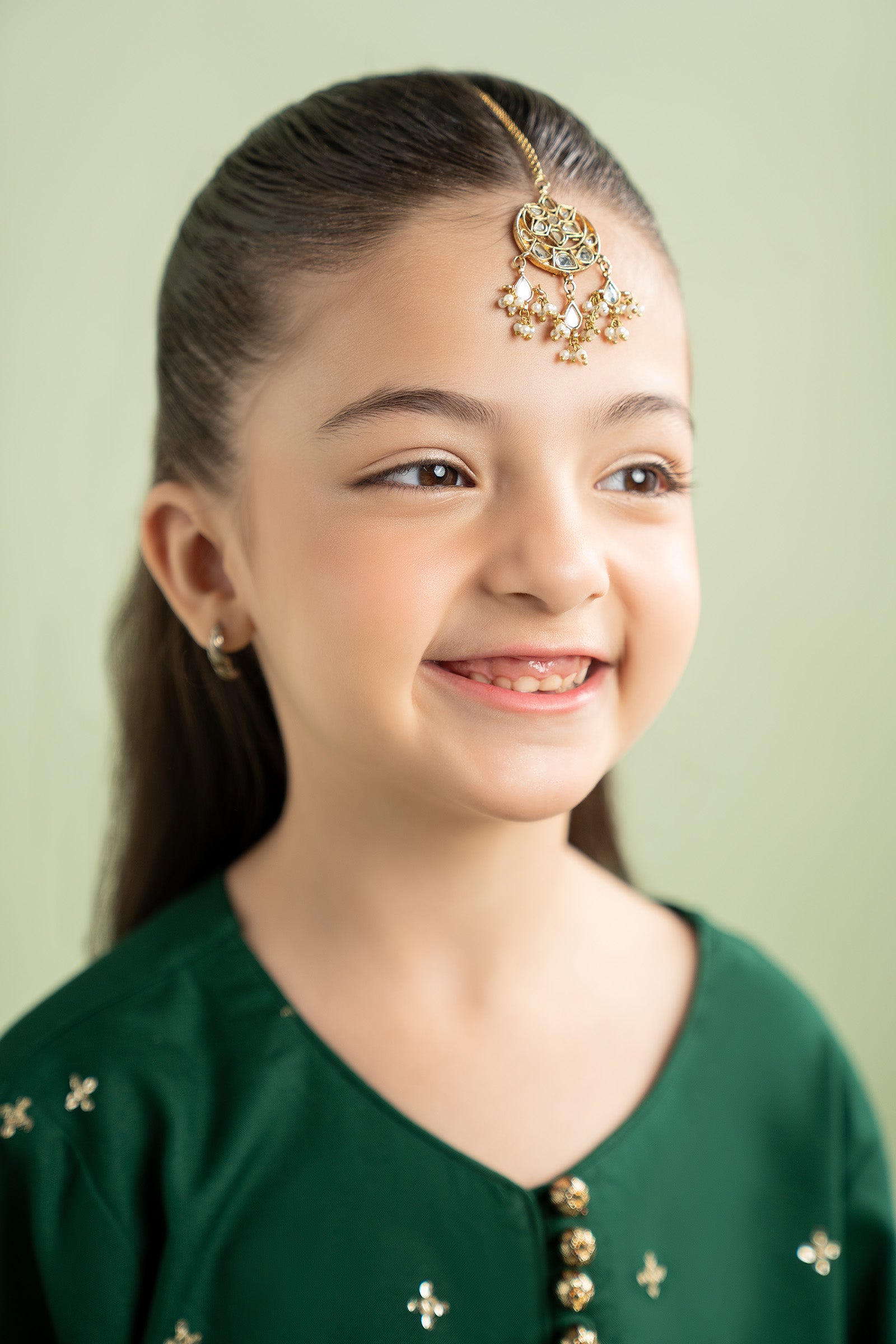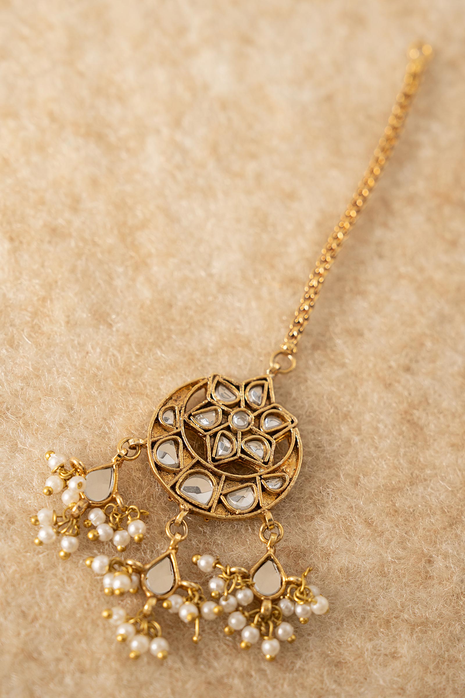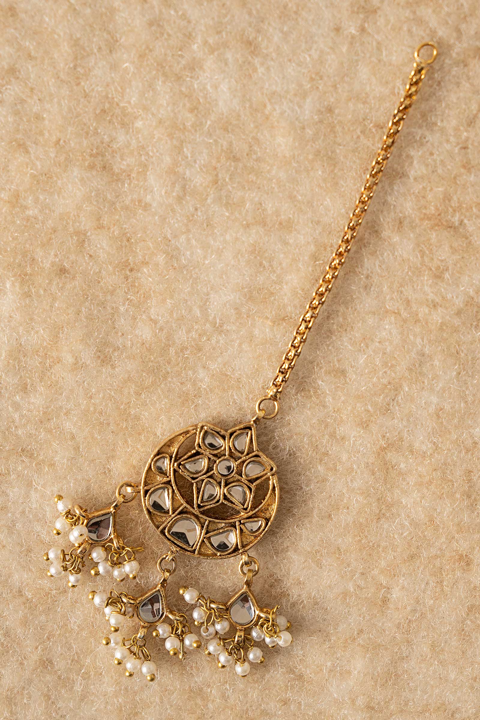 Twinkle like the stars with this adorable tikka, where sparkling white handcut glass meets soft, dreamy pearl pyroi. A magical blend of tradition and charm, made just for your little princess to shine bright on every festive day. Finish: 21K Gold Plated Product Care: Wipe Clean