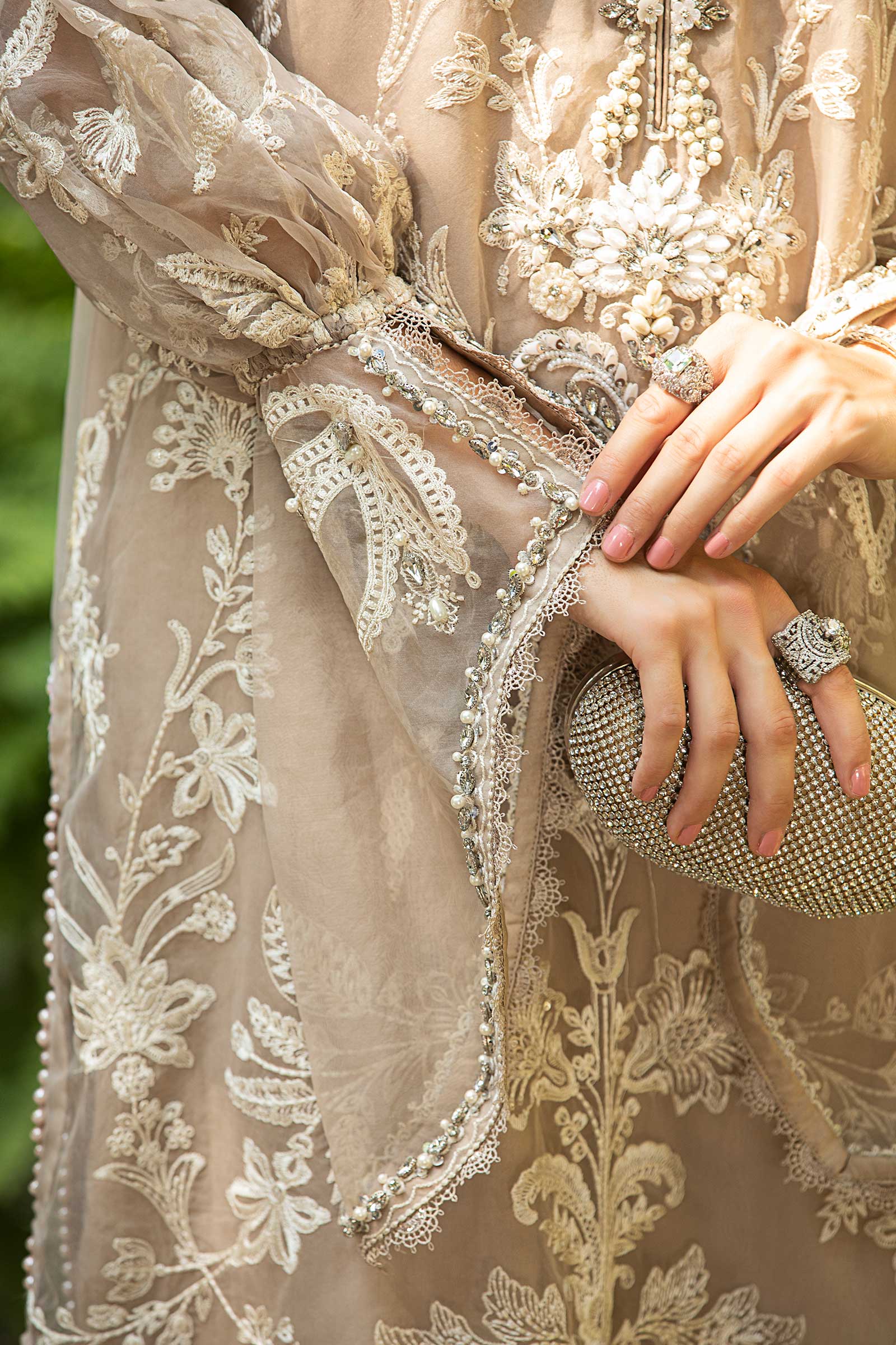 3 PieceShirt Fabric: OrganzaTrouser Fabric: Cotton SatinDupatta Fabric: OrganzaOrganza fully embroidered long shirt with embroidered sleeves, Embellished neckline, border, and sleeves. Cotton satin straight trousers. Organza dupatta four sides embroidered border