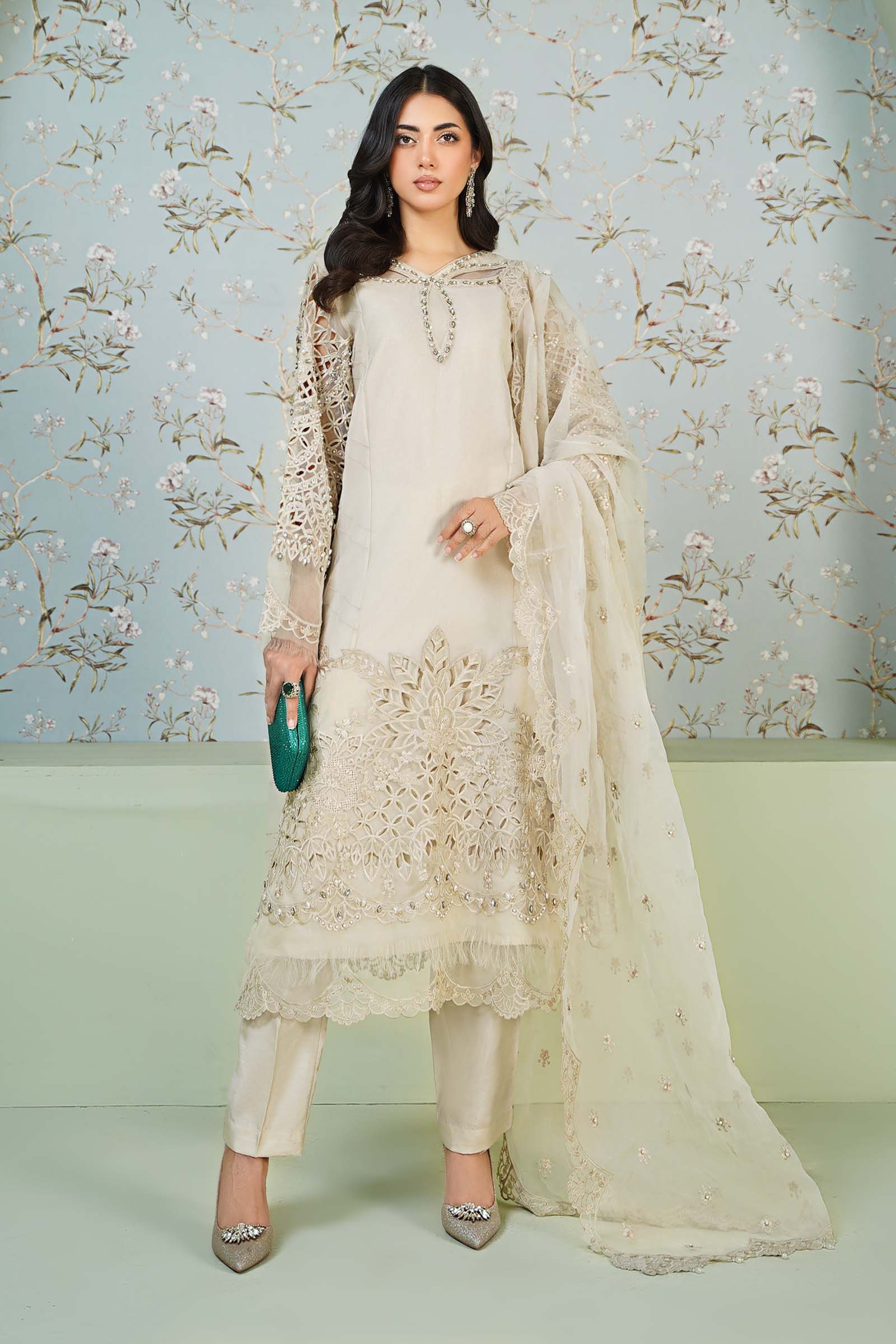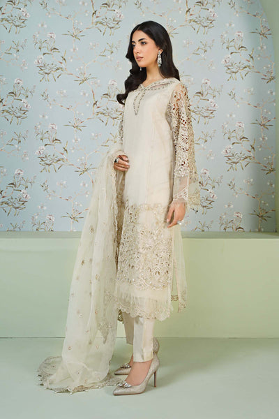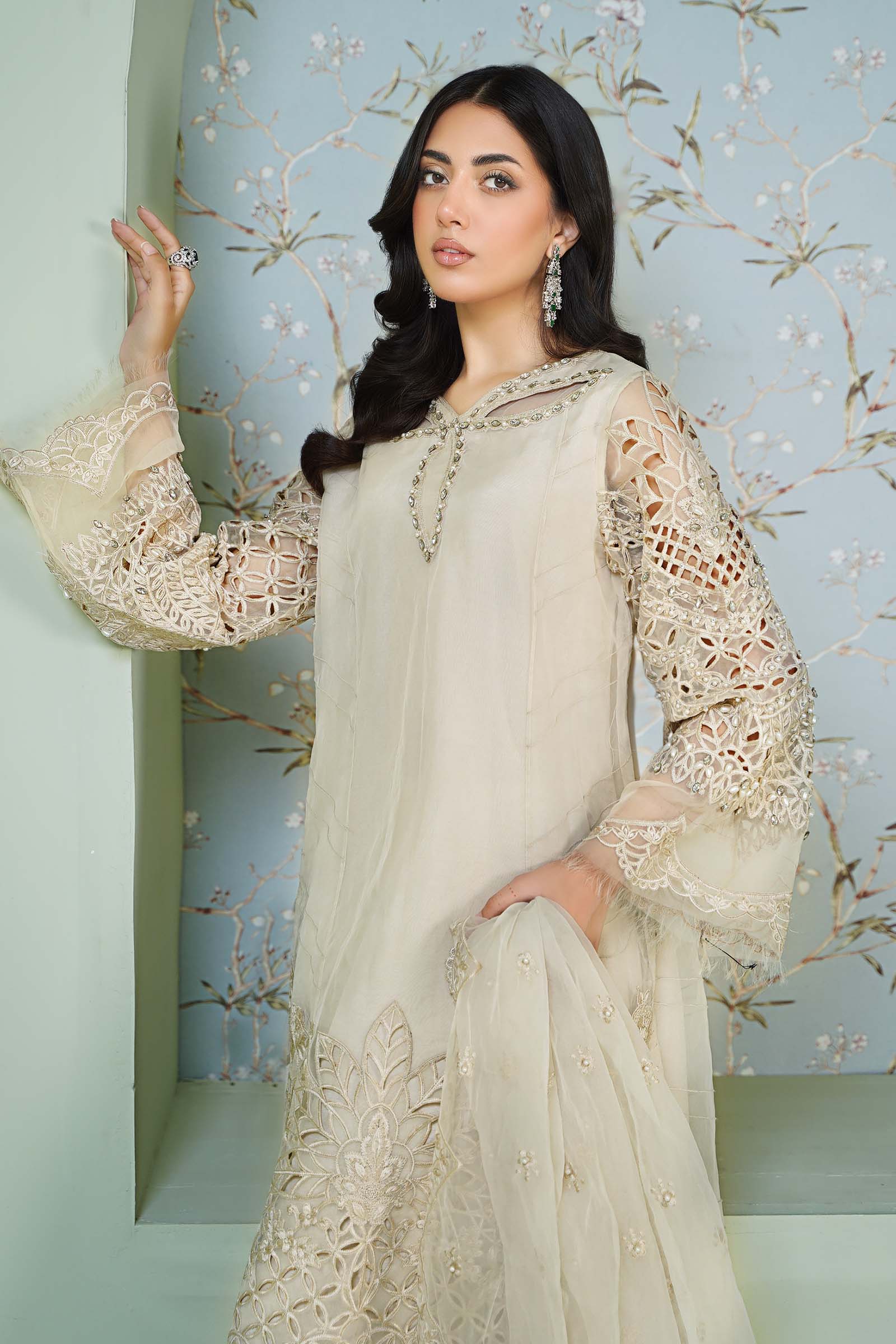 Laser Cutwork Embroidered Full Length Sleeves With Pearl, Stone & Frayed Organza Detailing
