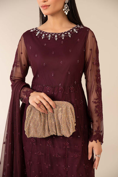 Long panelled frock with embroidered panels and yoke with embroidered border on sleeves and hem Crystal and stone work on neckline Paired with matching straight pants and embroidered dupatta with embroidered border on pallu