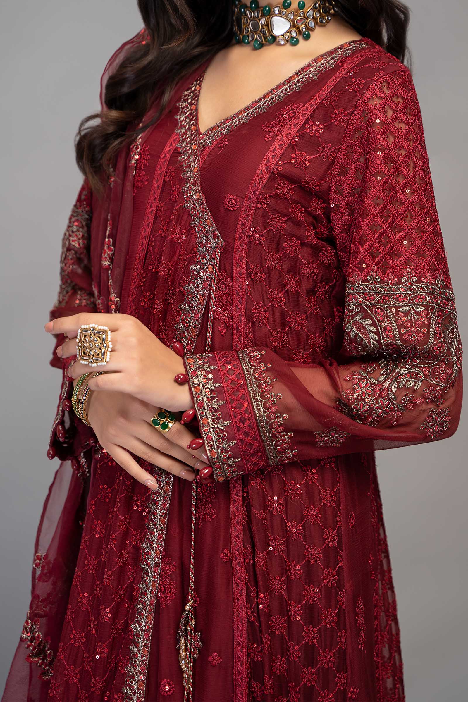 Draped in tradition's artistry, Our angrakha weaves a tale of timeless elegance that creates a glamorous look. Details ShirtDyed Angrakha With ChikankariEmbroidered Neckline With TasselsDyed Front With EmbroideryLong Sleeves With EmbroideryDyed Back With EmbroideryFit: RegularColor: RedFabric: ChiffonUndershirt Dyed Sleeveless UndershirtFit: RegularColor: RedFabric: Cotton Satin TrousersDyed Straight Fit TrousersElasticated WaistbandFit: RegularColor: RedFabric: Cotton SatinDupattaDyed Dupatta With EmbroideryColor: RedFabric: OrganzaWork Details: Thread, Sequins & Tilla EmbroideryModel is wearing XS sizeNote: Dry Clean Only