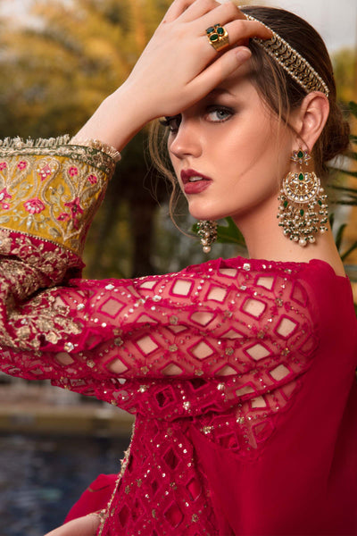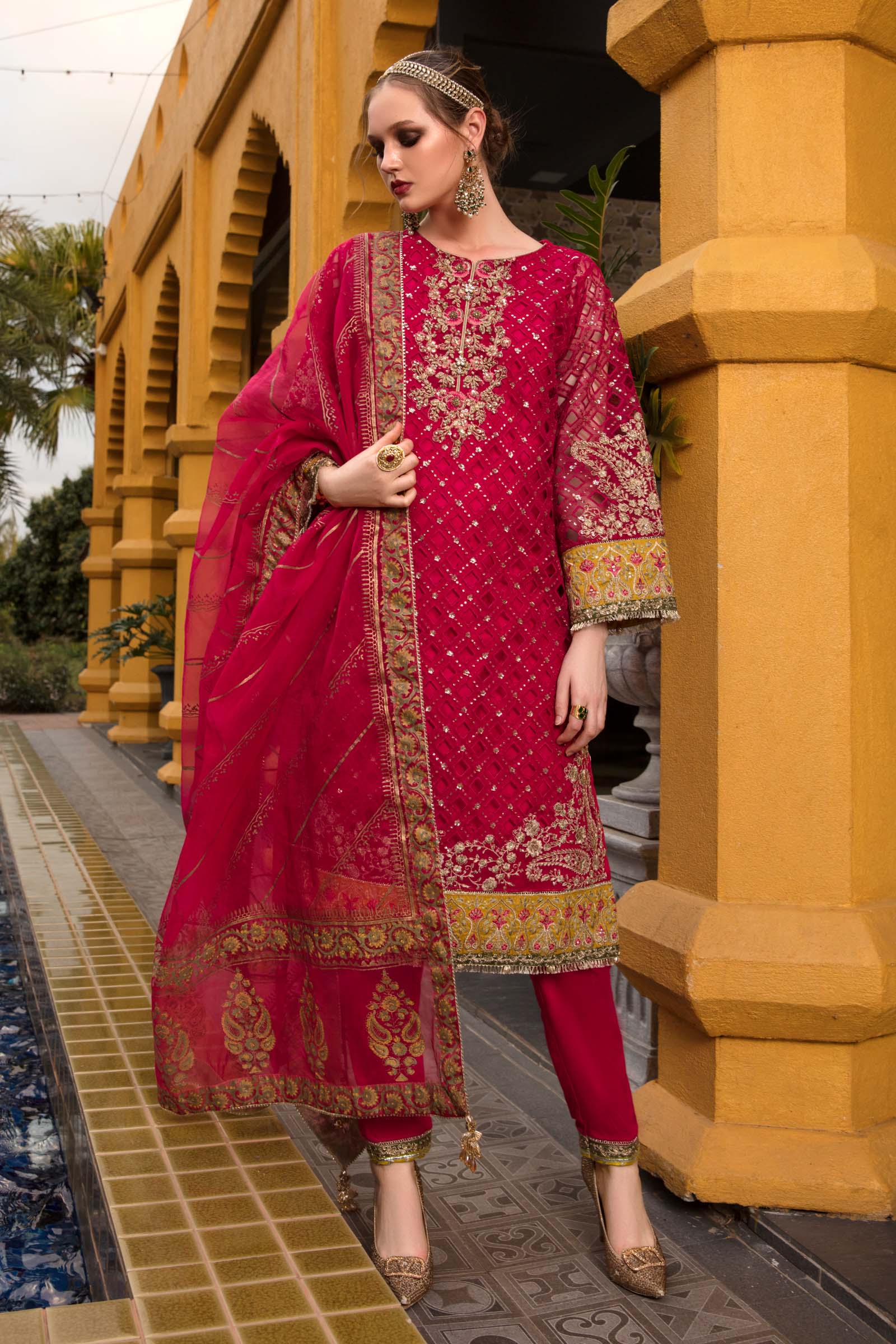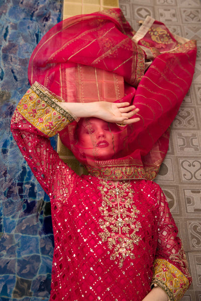 Fully embroidered shirt with cutwork and embroidered neckline, ghera and sleeves and embroidered lace on ghera and sleeves. Trouser finished with embroidered lace and block printed organza dupatta finished with trim lace and beautiful handmade tassels.