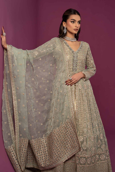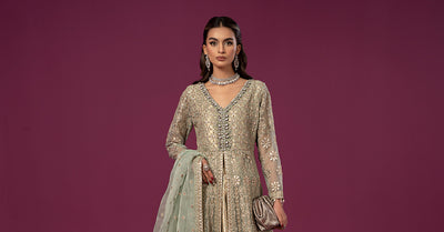 Details: Embroidered Front Open Gown, Embellished V Neckline, Sequins & Tilla Embroidered Sleeves & Border