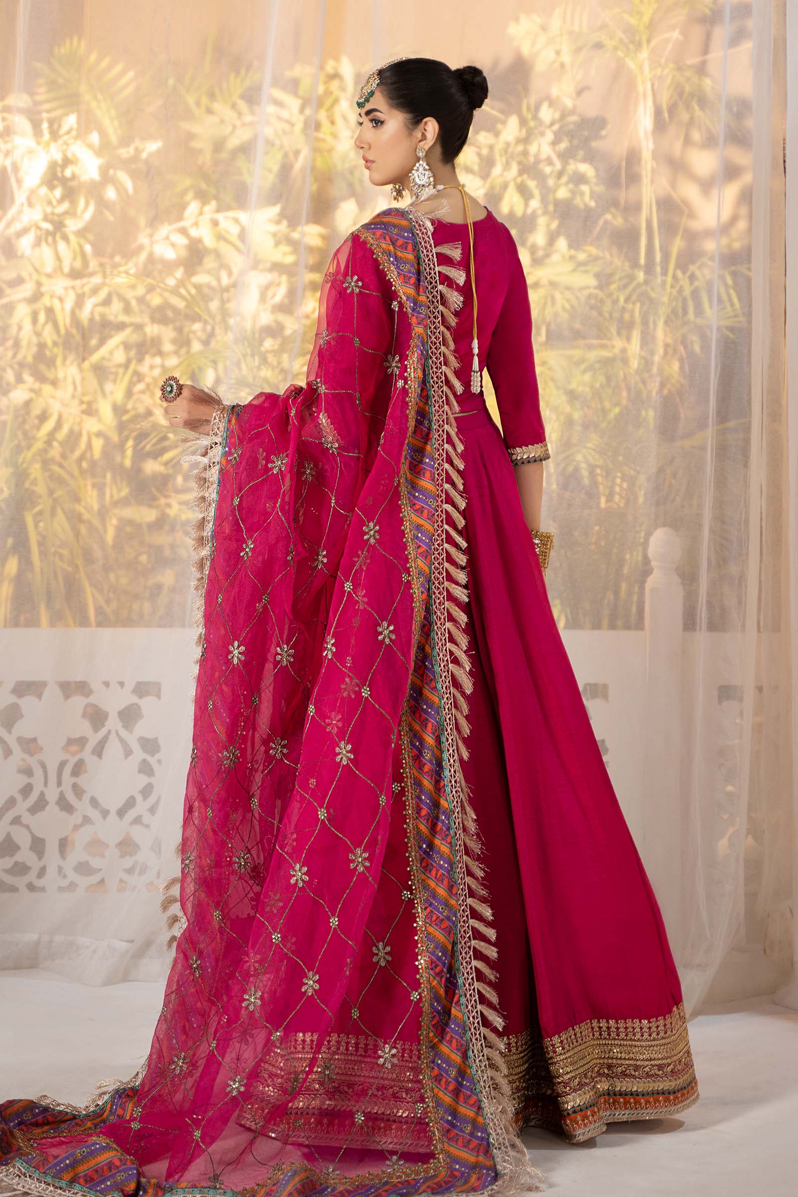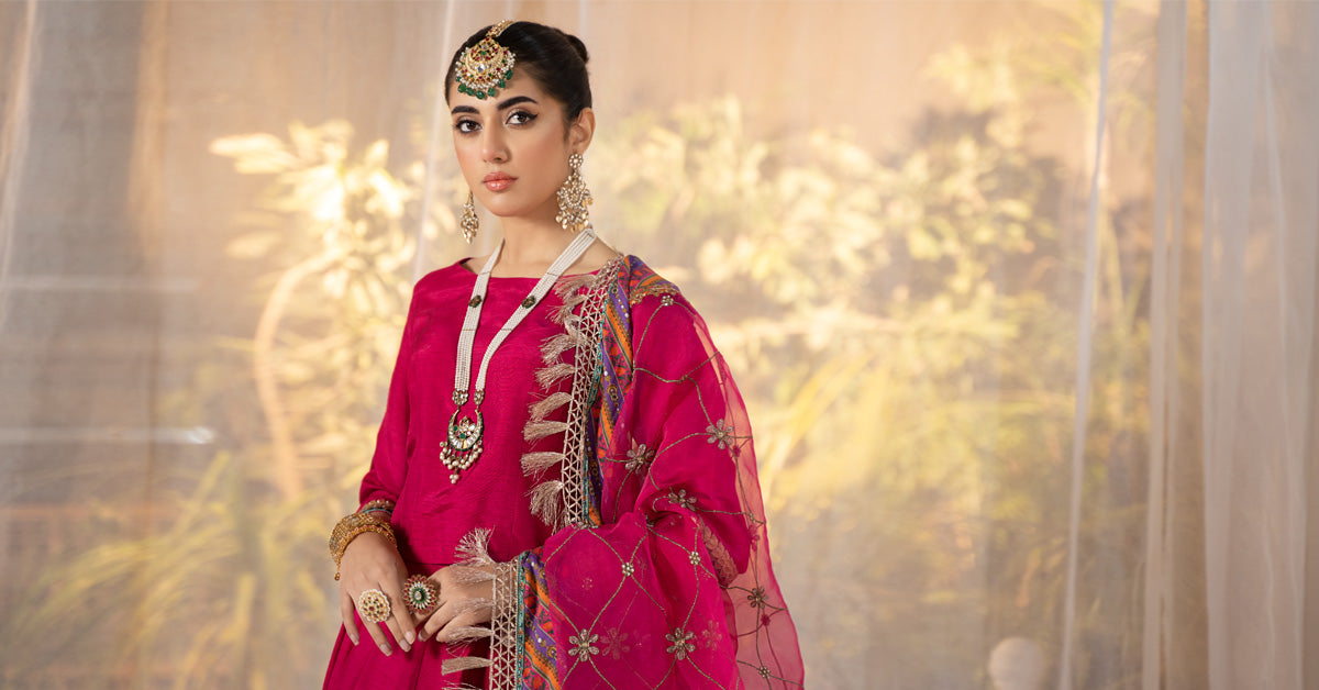 Our three-piece dyed-embroidered raw silk ensemble features a lehenga blouse design intricately adorned with tilla, sequins, and thread embroidered borders, adding to its grace, is the jaal embroidered dupatta heightened with a chatta-patti and kiran lace borders. This captivating lehenga suit encapsulates sophistication and timeless allure in its design sensibility. Shirt Details: Dyed Blouse, Round Neckline, Straight Sleeves With Sequins, Tilla & Thread Embroidered BorersColor: PinkFabric: Raw SilkTrousersDetails: Dyed Lehenga With Sequins, Tilla & Thread Embroidered BordersColor: PinkFabric: Raw SilkDupatta Details: All-Over Tilla Jaal Embroidery With printed Chatta-Patti & Kiran-Laced BordersColor: PinkFabric: OrganzaNote: Only Dry CleanModel is wearing size xs