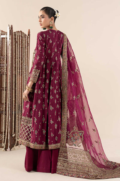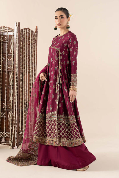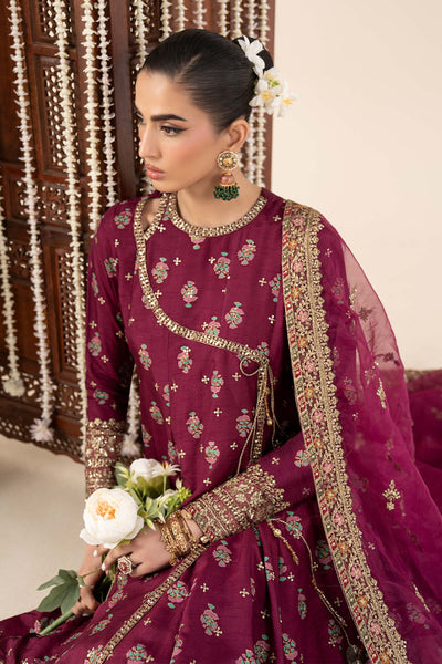 Highlighting classical and feminine intricacies with our three-piece embroidered raw silk suit, featuring an embroidered angrakha embellished with tassels, adorned with dyed dhaka trousers, and an embroidered dupatta with borders weaving classical tales with meticulous embroidery makes it a statement choice for ever-lasting soirees.